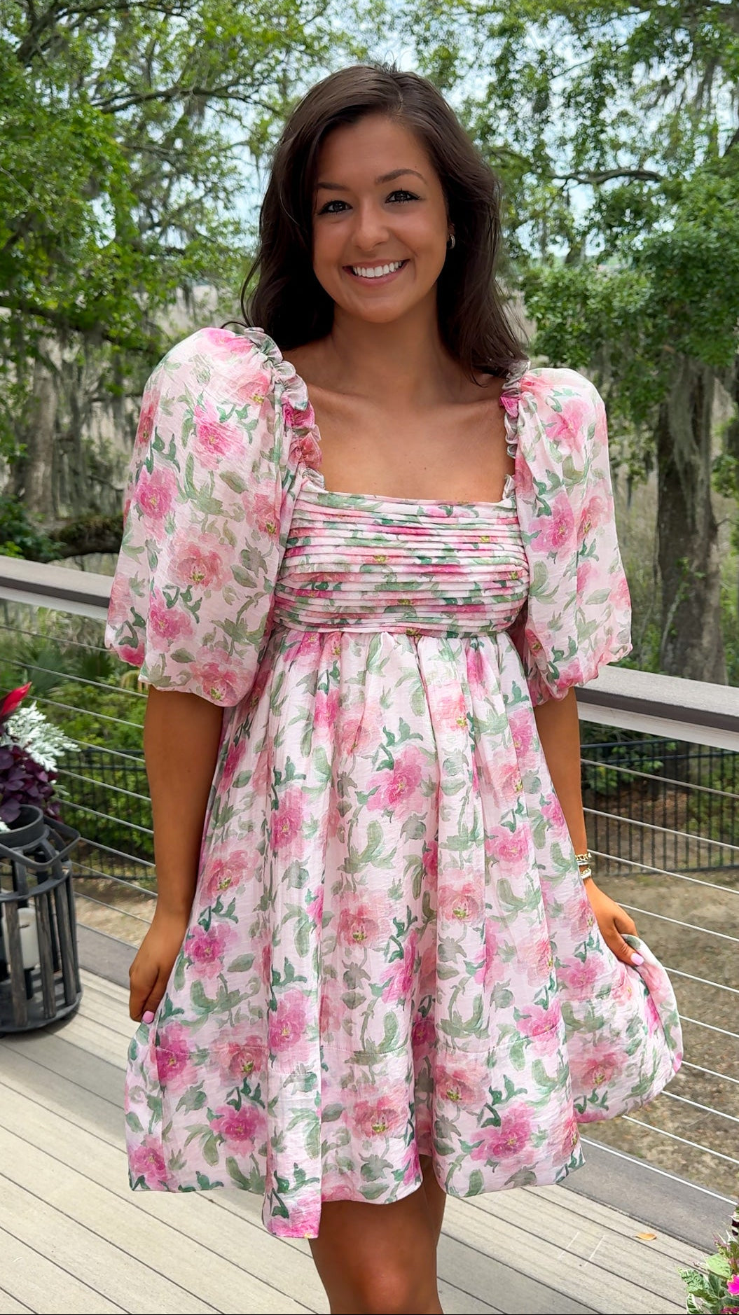 The Elizabeth Dress is a statement piece — crafted from vibrant multi-color floral jacquard with dimensional texture and ruffled accents that add romantic movement. Its structured mini silhouette creates a refined, polished look, finished with a sleek back zipper for an easy, elegant fit. She's one you don't want to miss!