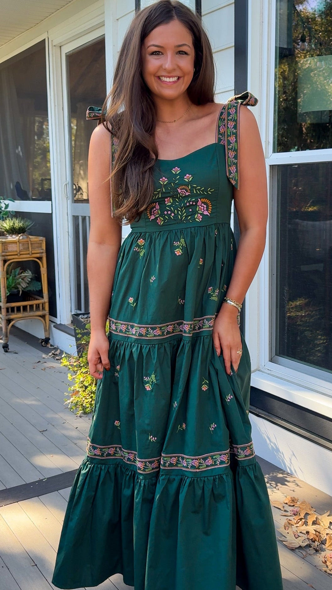 The Rainey Dress is where timeless + romantic meet. A green embroidered maxi moment that feels effortlessly feminine. With self-tie straps, a smocked back, and a beautifully tiered skirt, she’s made for twirling, celebrating, and everything in between.
