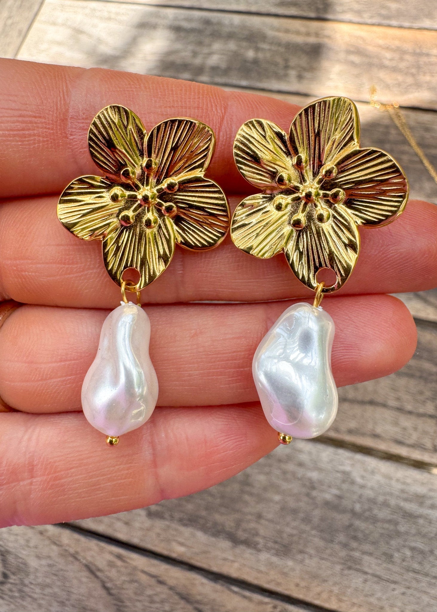 Mia Earrings – 18K Gold Plated Flower Pearl Drops, Water-Resistant