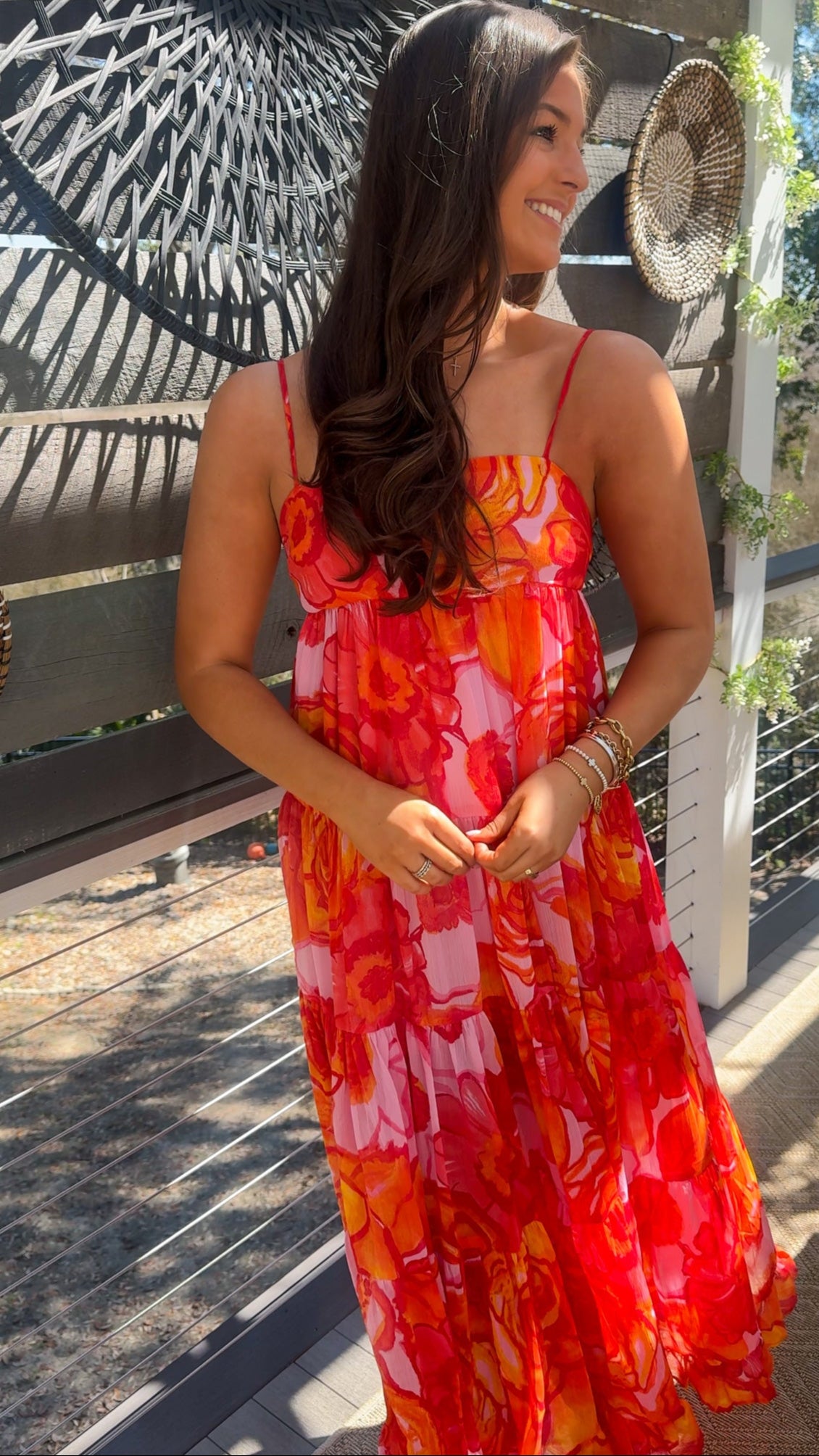 Embrace effortless beauty with the Hallie Midi Dress, your perfect companion for tropical vacations, beach getaways, and sunny escapes. With its breezy chiffon fabric, delicate floral print, and flowing tiered skirt, this dress is made for strolling along the shore, exploring charming seaside towns, or enjoying a sunset dinner.