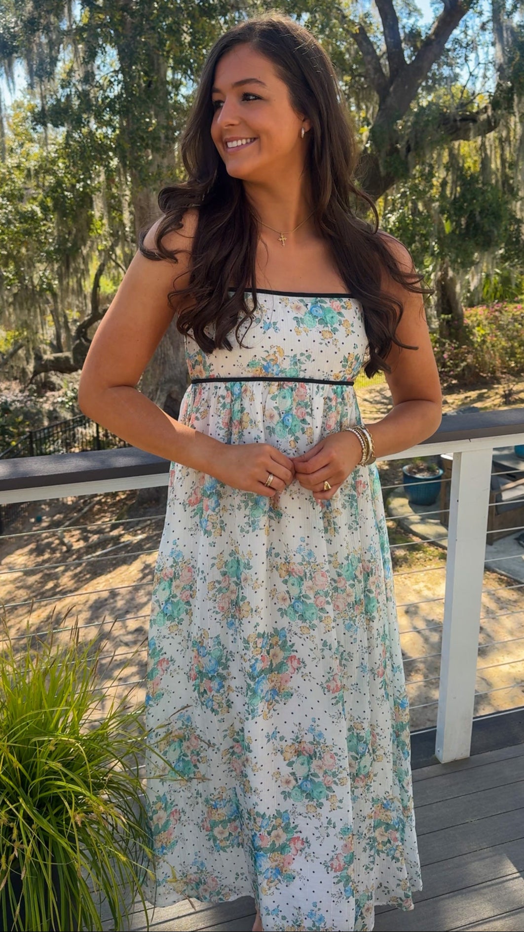 The Riley Midi Dress is all about easy elegance. The flowy, midi-length design offers comfort and movement, making it perfect for everything from lunch dates to garden parties. Its charming polka dot pattern combined with delicate floral details adds a touch of fun and flair. Whether you pair it with sandals or dress it up with heels, this dress will quickly become your new go-to for effortless style.