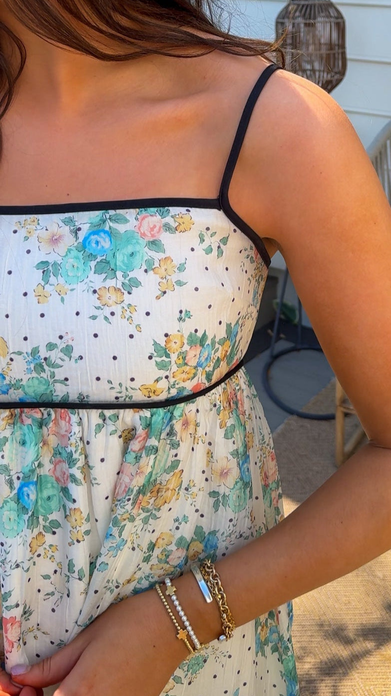 Get ready to turn heads with the Riley Midi Dress! With its flattering flowy silhouette, this dress is perfect for any occasion, from a casual day out to a chic evening event. The playful polka dot and floral detailing bring a unique touch of whimsy, ensuring you'll stand out wherever you go. Don't miss the chance to add this showstopper to your wardrobe—it’s a must-have for those who love fun, fashionable style.