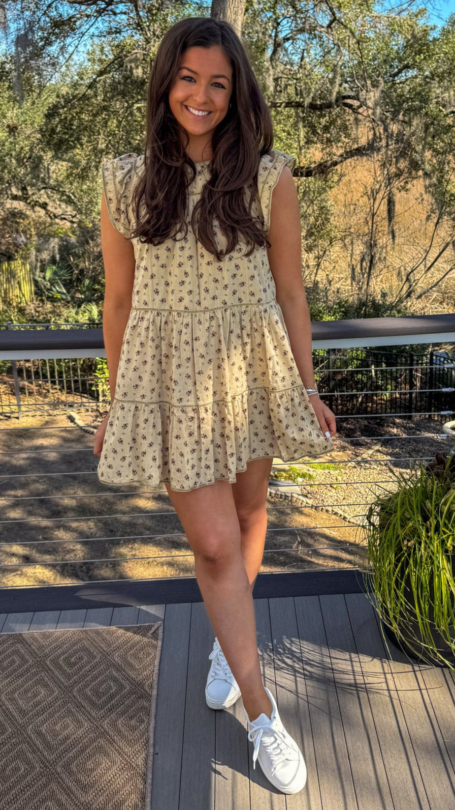 Sarah Dress – Ditsy Floral Bouquet Mini Dress with Ruffled Sleeves