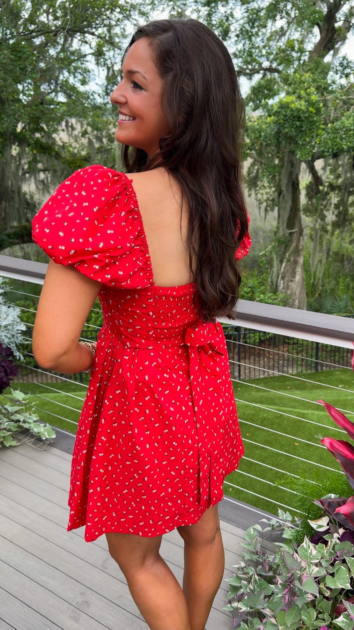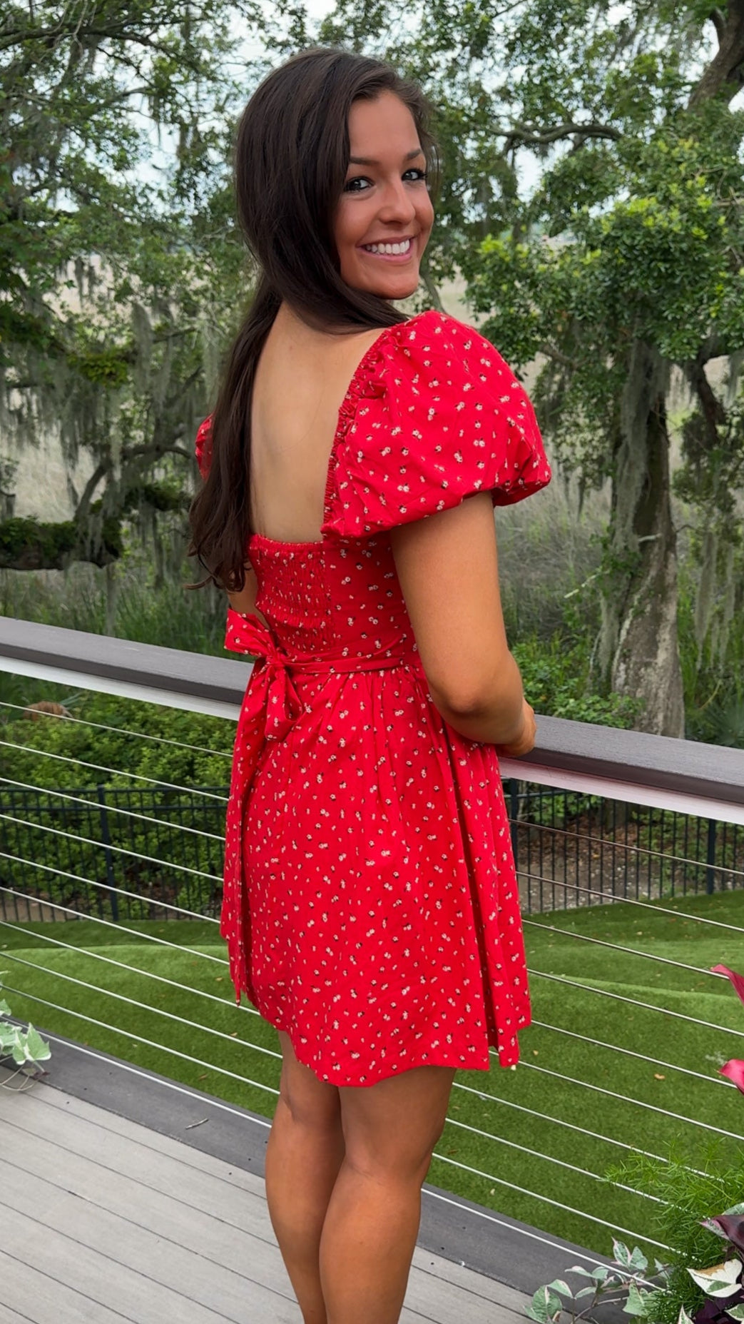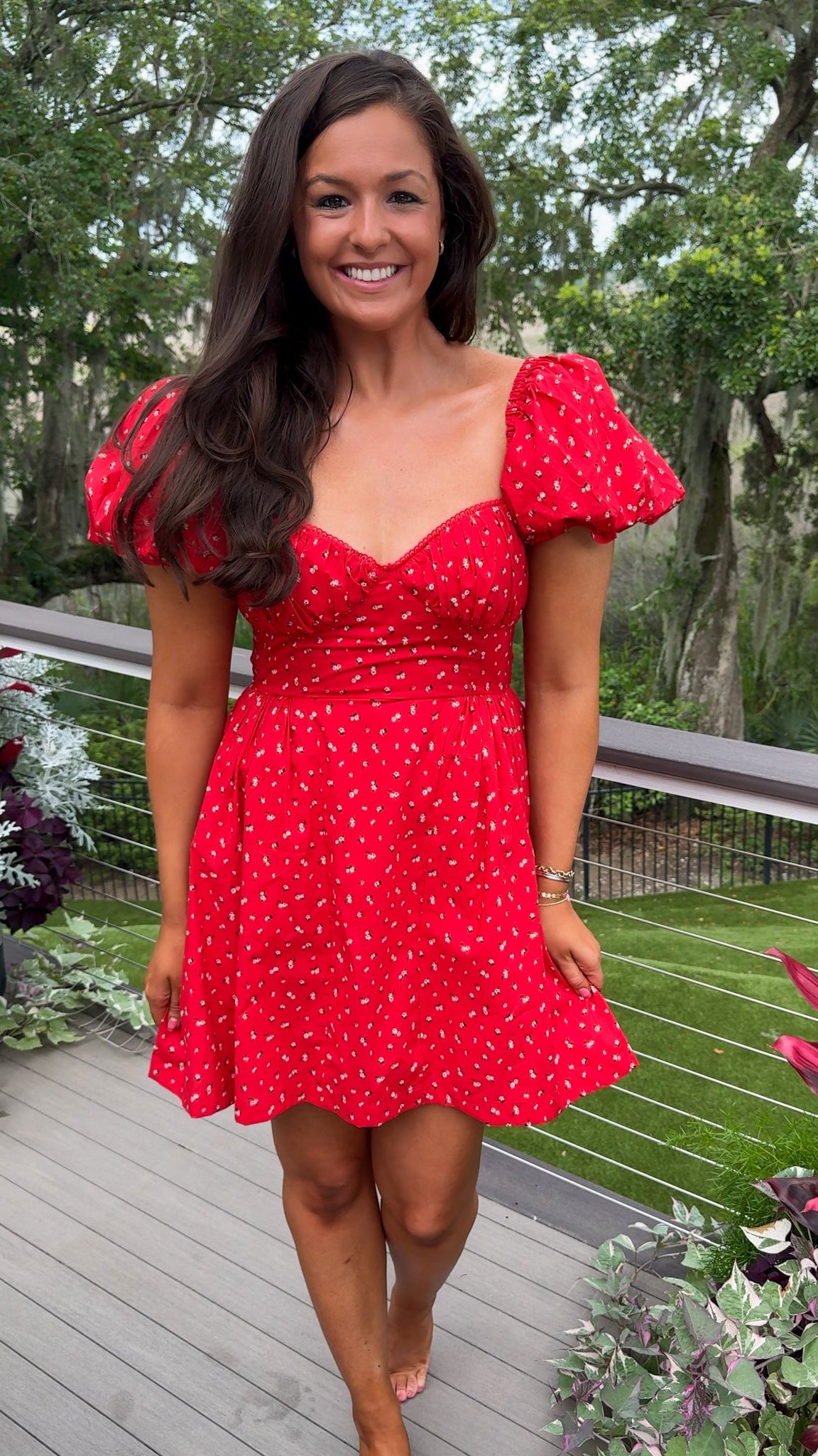 The Tatum Dress is crafted in a bright red floral print that instantly adds energy to your wardrobe. Its sweetheart neckline and puff sleeves create a soft, romantic shape, while the smocked back and invisible zipper make for a smooth, comfortable fit. The back tie detail adds just the right amount of charm, making this mini dress ideal for everything from daytime dates to dinner parties. Fully lined for coverage and ease.