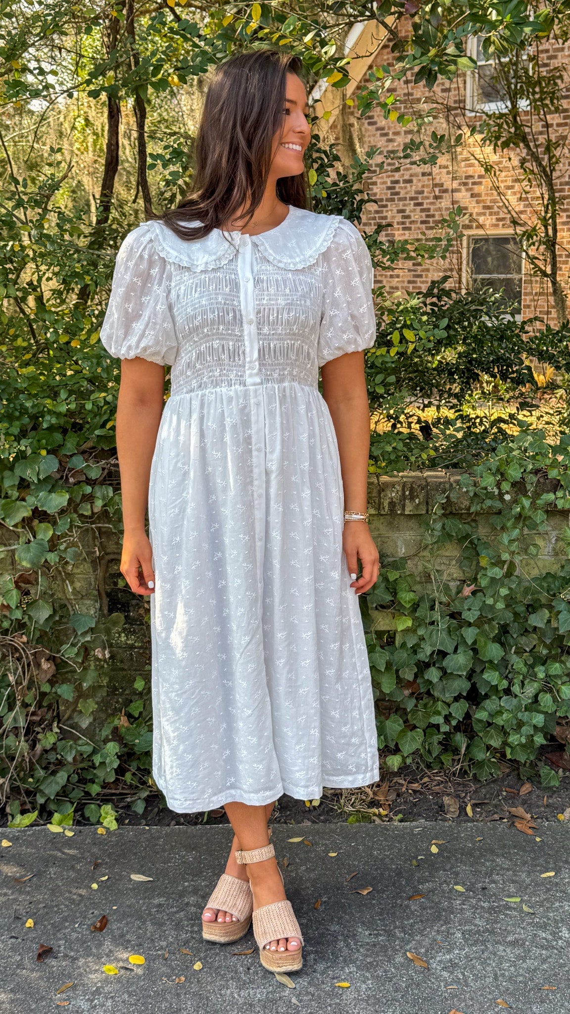 Elevate your wardrobe with the effortlessly charming Tia Midi Dress. Designed with delicate embroidered puff sleeves, a flattering smocked bust, and a classic button-down front, this dress blends elegance with everyday wear. Whether you're heading to brunch, a garden party, or a special event, this midi dress ensures you’ll look and feel beautiful.