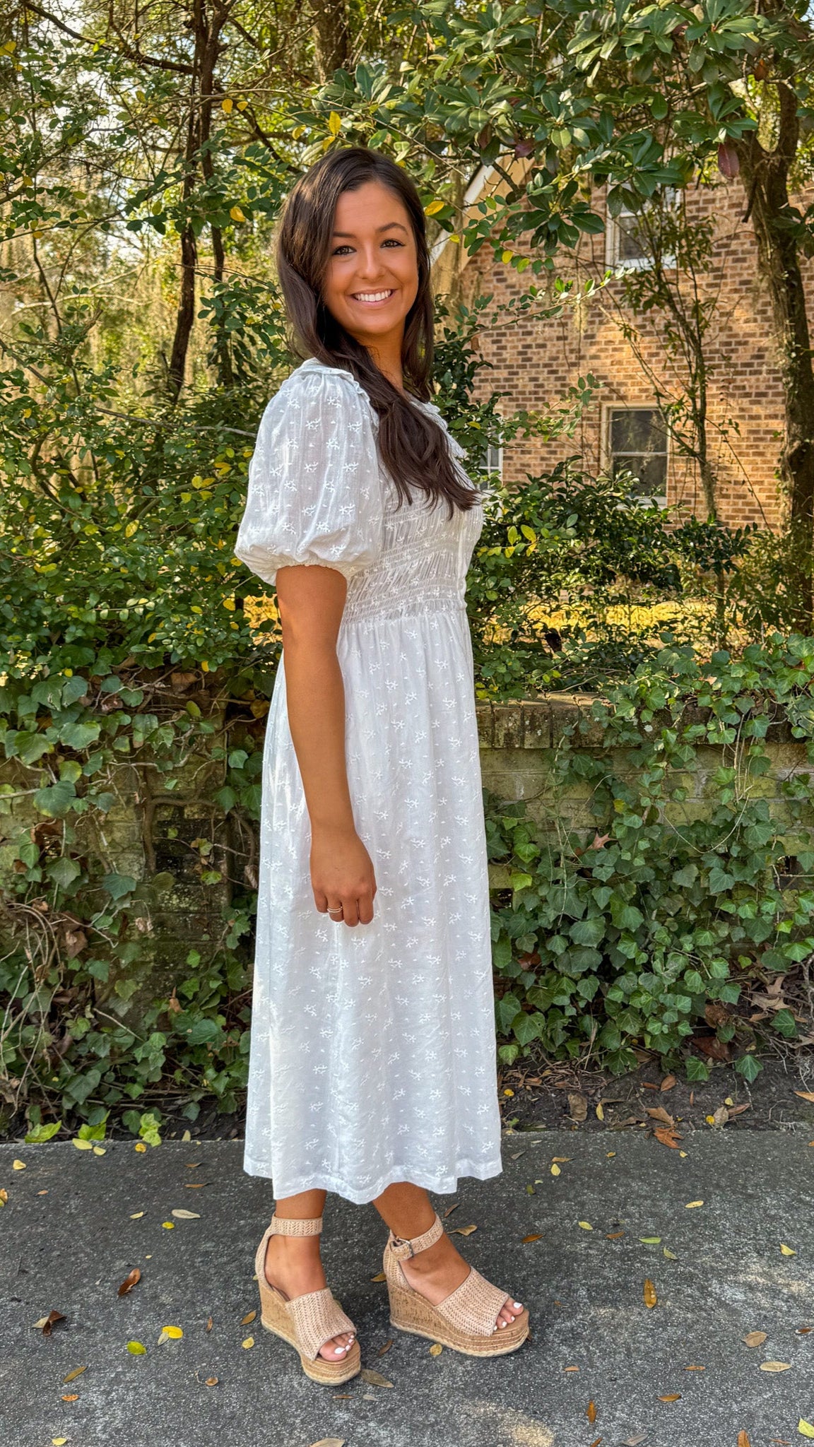 Tia Midi Dress – Embroidered Puff Sleeves & Smocked Bust for a Feminine Touch