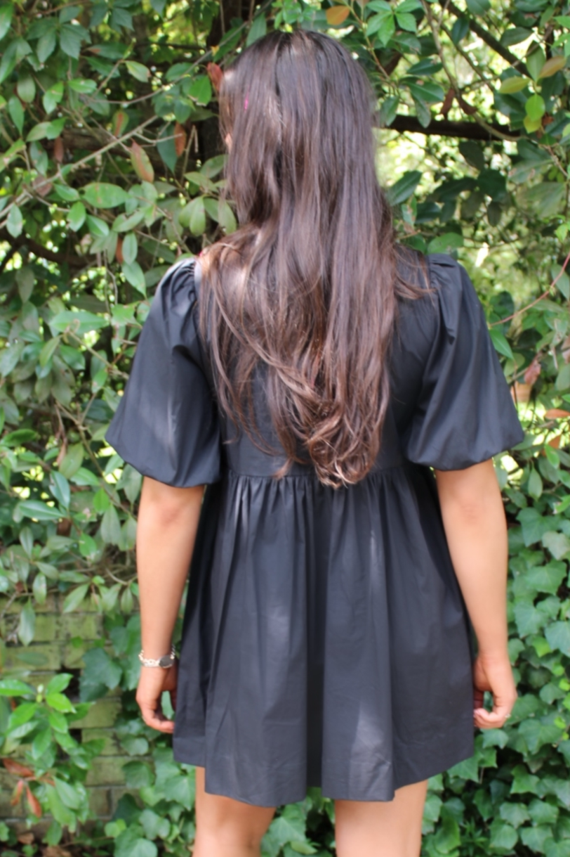 Experience a touch of elegance and charm with our Jenna Mini Dress in Black. Perfect for any occasion, this dress features delicate puff sleeves and a sweet bow front that will surely make you stand out in this babydoll dress.