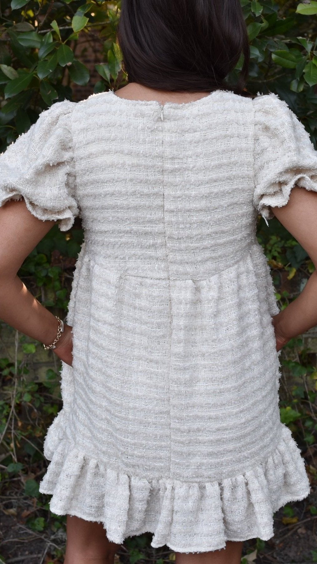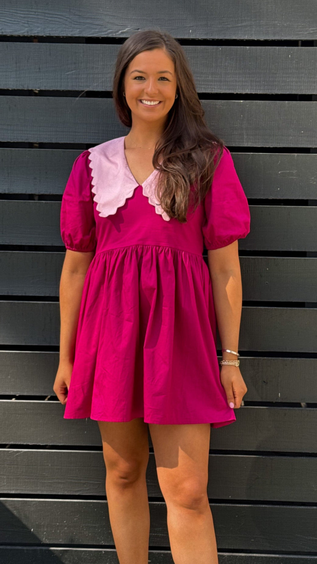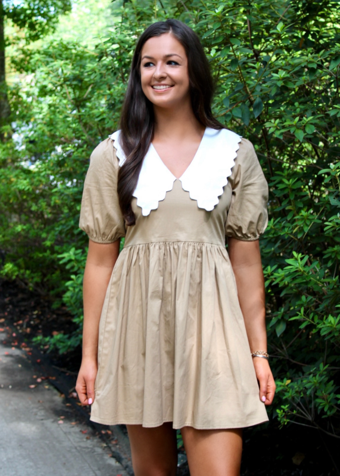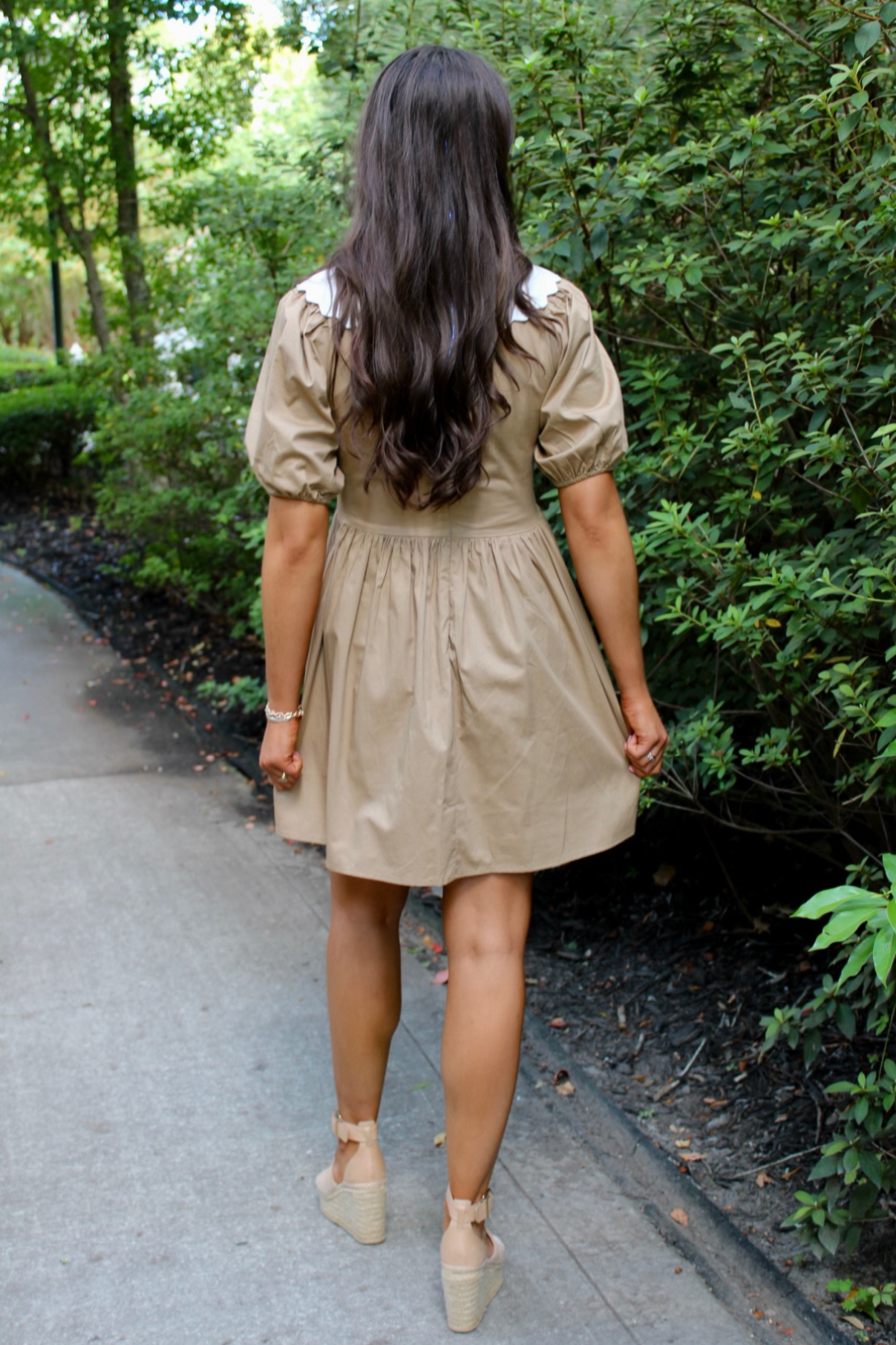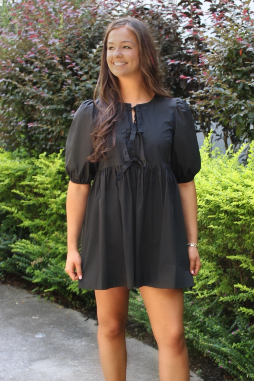 Women’s blue denim babydoll dress featuring a square neckline, long puff sleeves, and a loose, comfortable silhouette.
