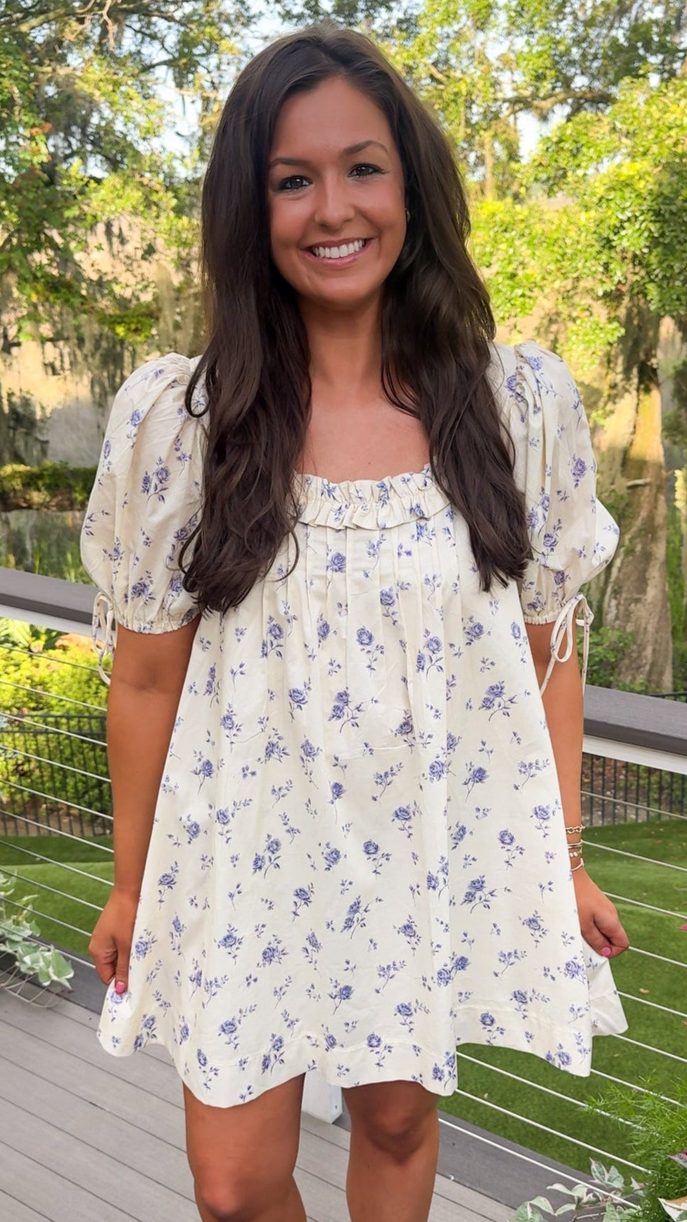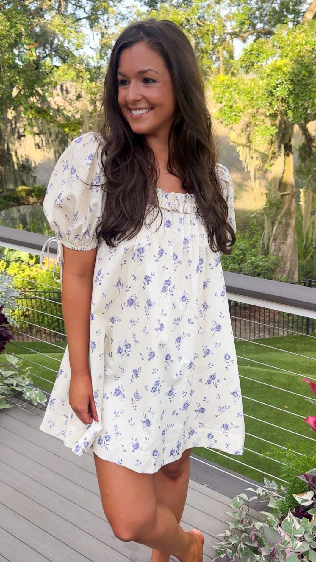 If your style leans feminine, airy, and just a little nostalgic, the Adelyn Dress is made for you. Its soft ivory base and delicate blue floral print instantly bring that timeless, romantic feel—no extra effort needed.