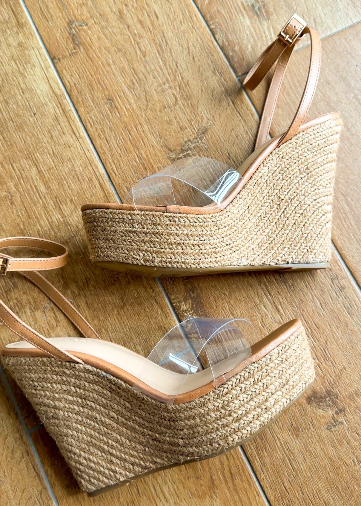 Effortlessly elevated and easy to style, the Coastal Clear Strap Wedge Sandal is the perfect neutral heel for spring and summer occasions. Designed with a woven espadrille-style wedge and a barely-there clear strap, this sandal creates a leg-lengthening look while keeping your outfit feeling light and polished.