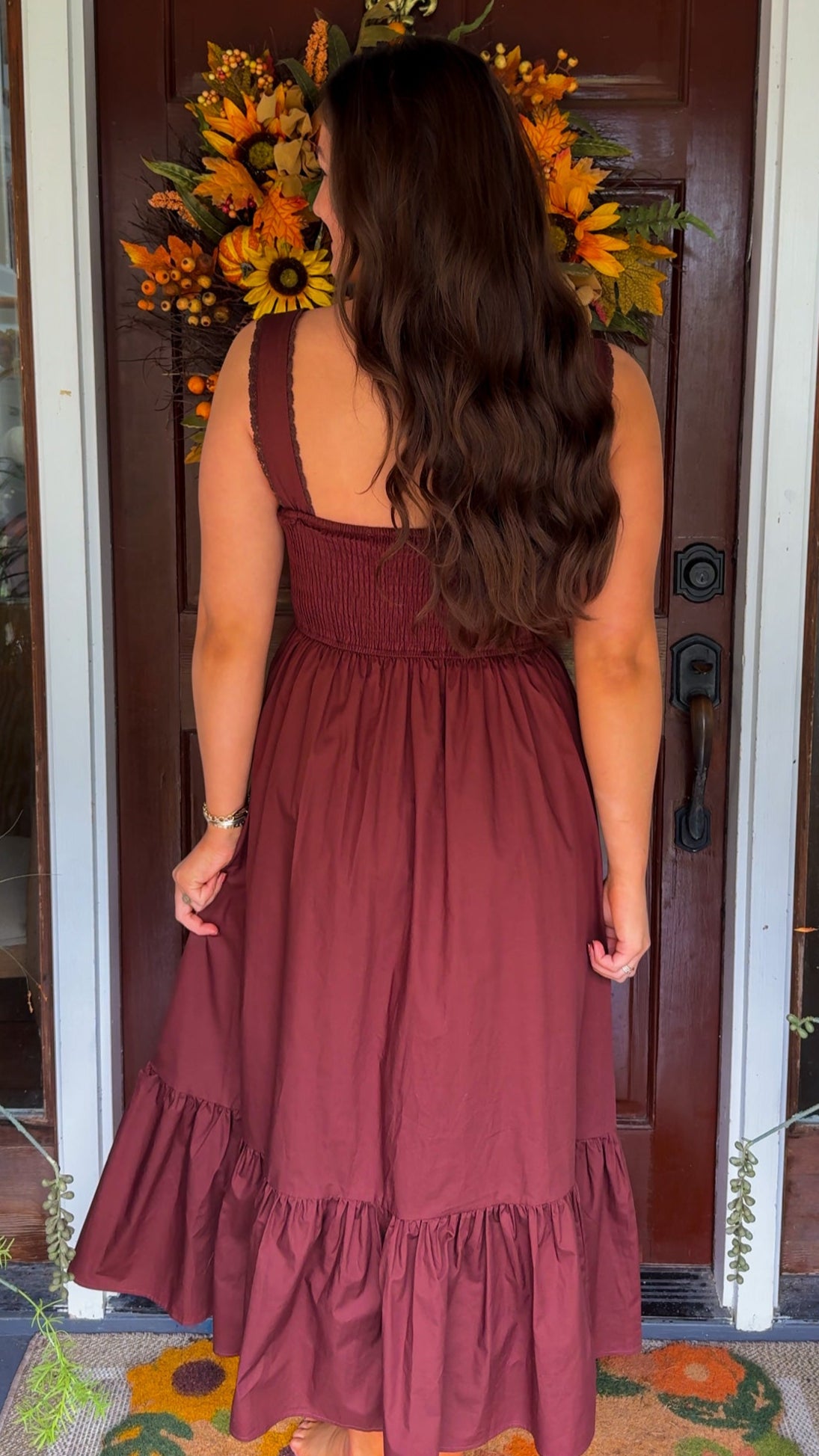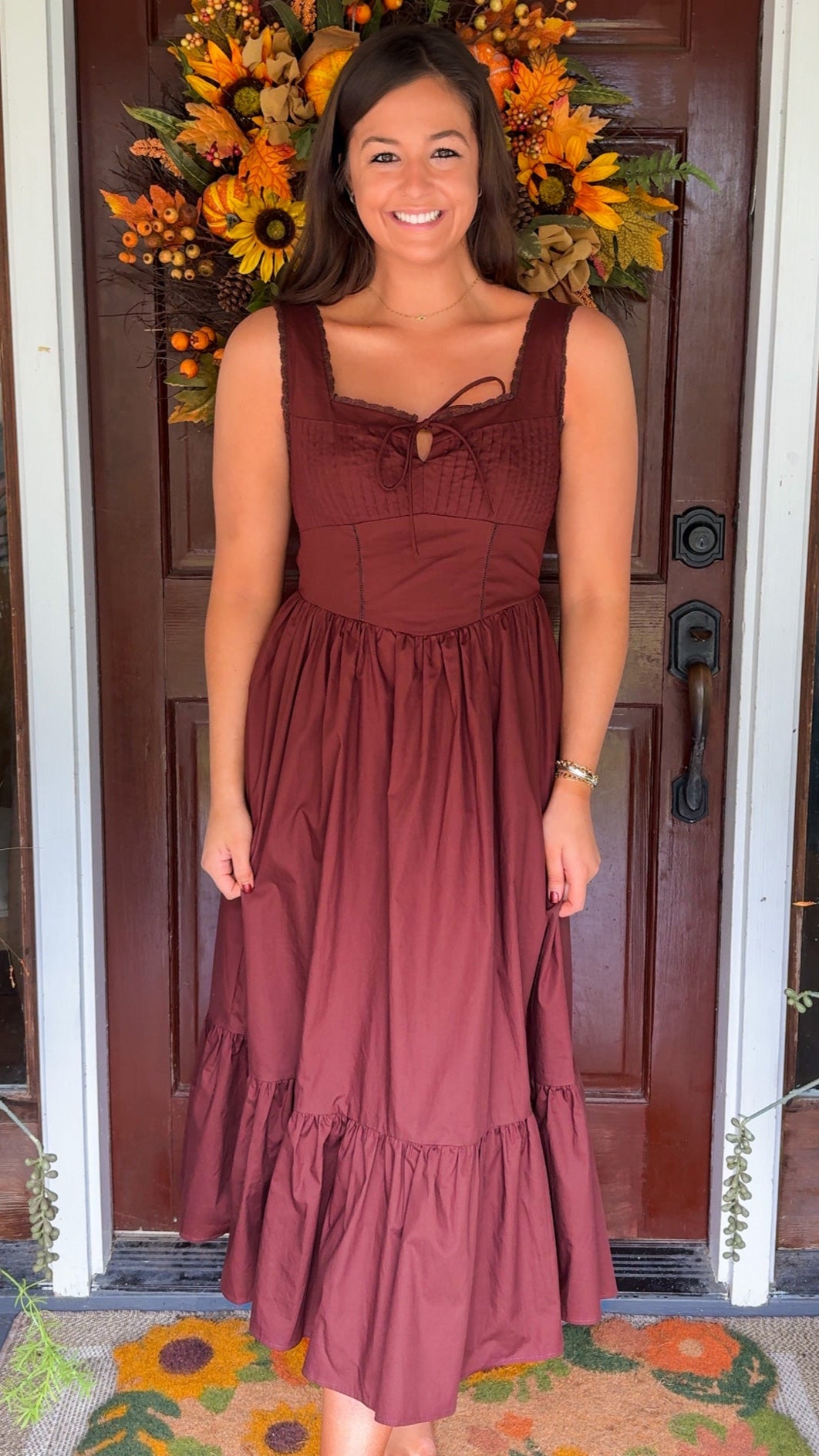 The square neckline with delicate lace trim adds classic elegance, and the gathered tiered skirt flows beautifully with every step, giving movement and grace. Side seam pockets add practical functionality without disrupting the silhouette. Pullover style makes it easy to wear alone or layered with a cardigan or jacket for cooler fall days.