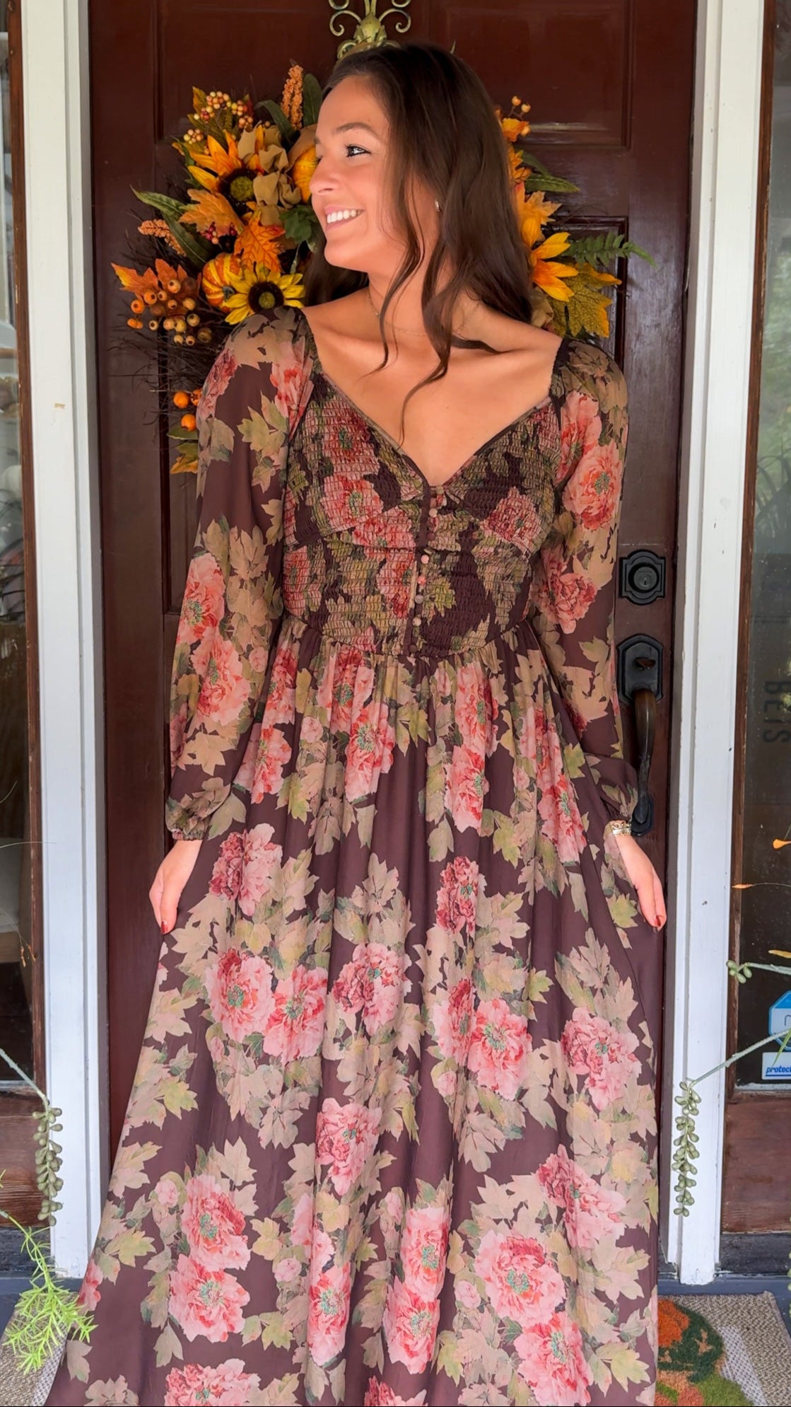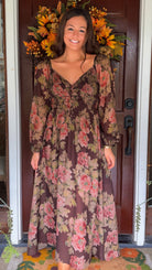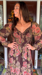 The Kit Floral Midi Dress in chocolate is your go-to for effortless fall elegance. With its flattering fit-and-flare silhouette, smocked bodice, and romantic puff sleeves, this dress makes you feel confident and stylish for everything from brunches to family gatherings. Its versatile design is perfect for layering or wearing on its own.