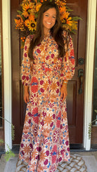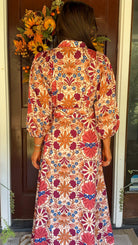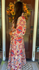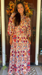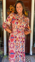 The Magnolia Floral Maxi Dress is made for fall moments when you want to feel polished and graceful without trying too hard. Its flowing silhouette, collared neckline, and waist-cinching belt make it the perfect choice for church, family photos, or festive dinners. In a palette of rich oranges, burgundies, and blues, this dress captures autumn’s beauty in every detail.