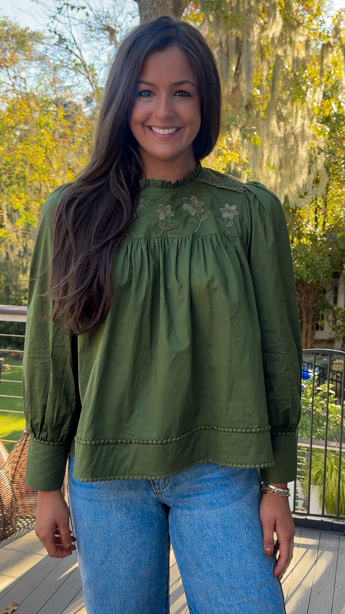 • Olive green long-sleeve blouse