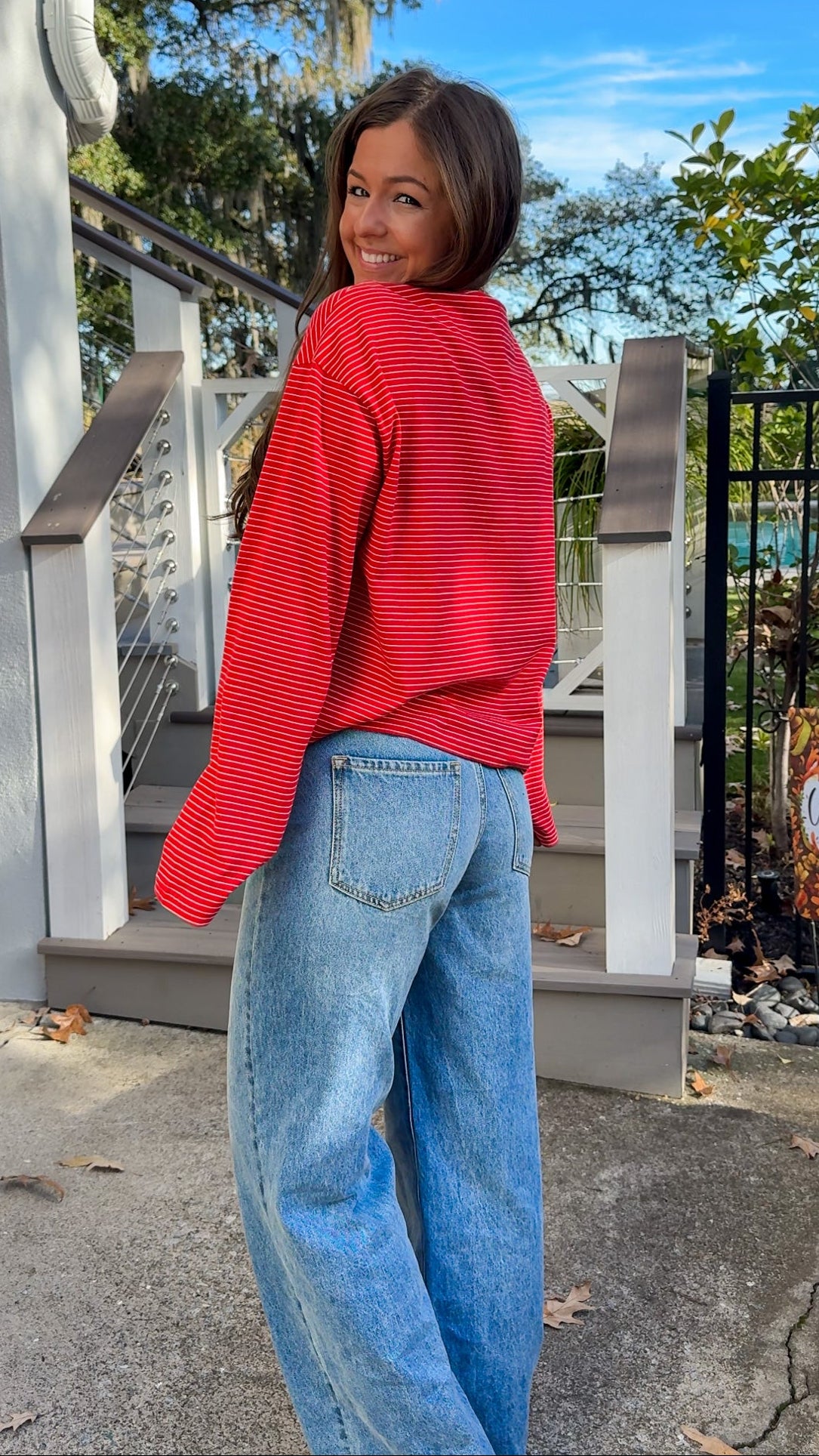 The Julia Red Stripe Long Sleeve Top is one of those effortless pieces you’ll reach for all season long. Pair it with denim for a cute, casual daytime look, or tuck it into trousers for something a little more polished. Its relaxed, lightweight fit also makes it perfect for layering under vests, jackets, or cardigans as the weather cools. Easy, comfy, and classic — it’s the kind of staple that makes getting dressed simple.