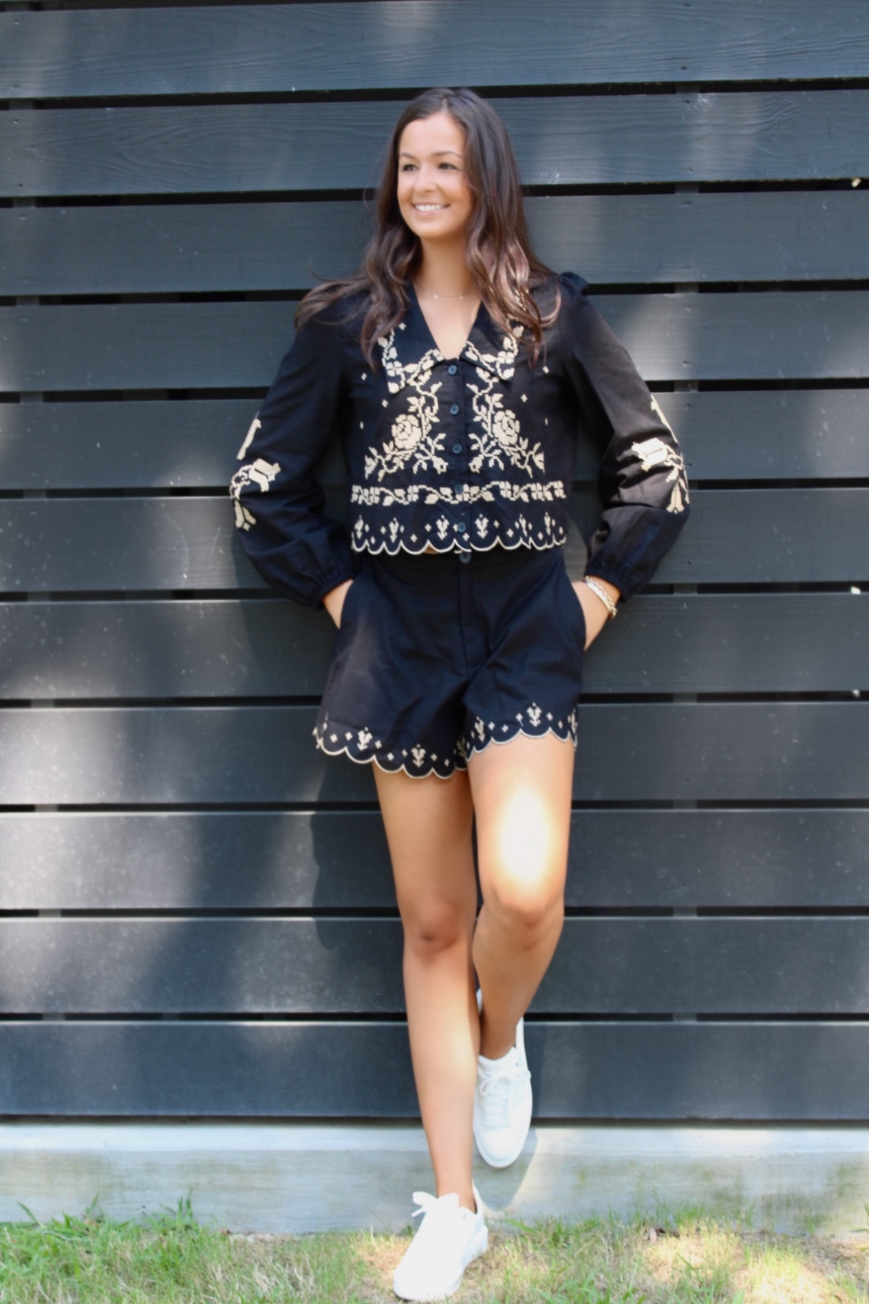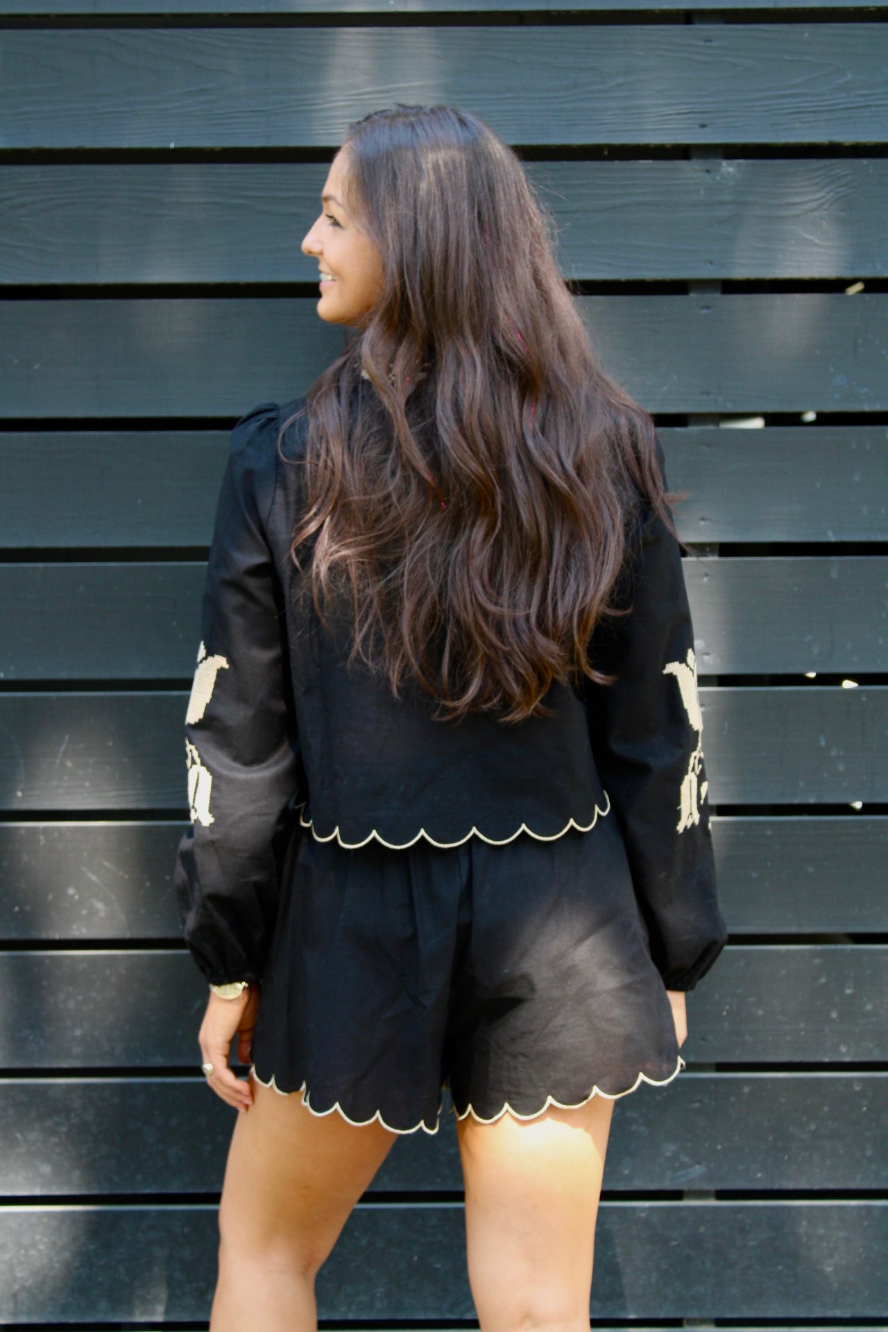 Elevate your wardrobe with our Audrey Set in black. This two-piece set features a long sleeve top with intricate taupe embroidery and matching shorts. Perfect for any occasion, and perfect for a transition piece to fall. Don't miss out on this stylish and versatile set!