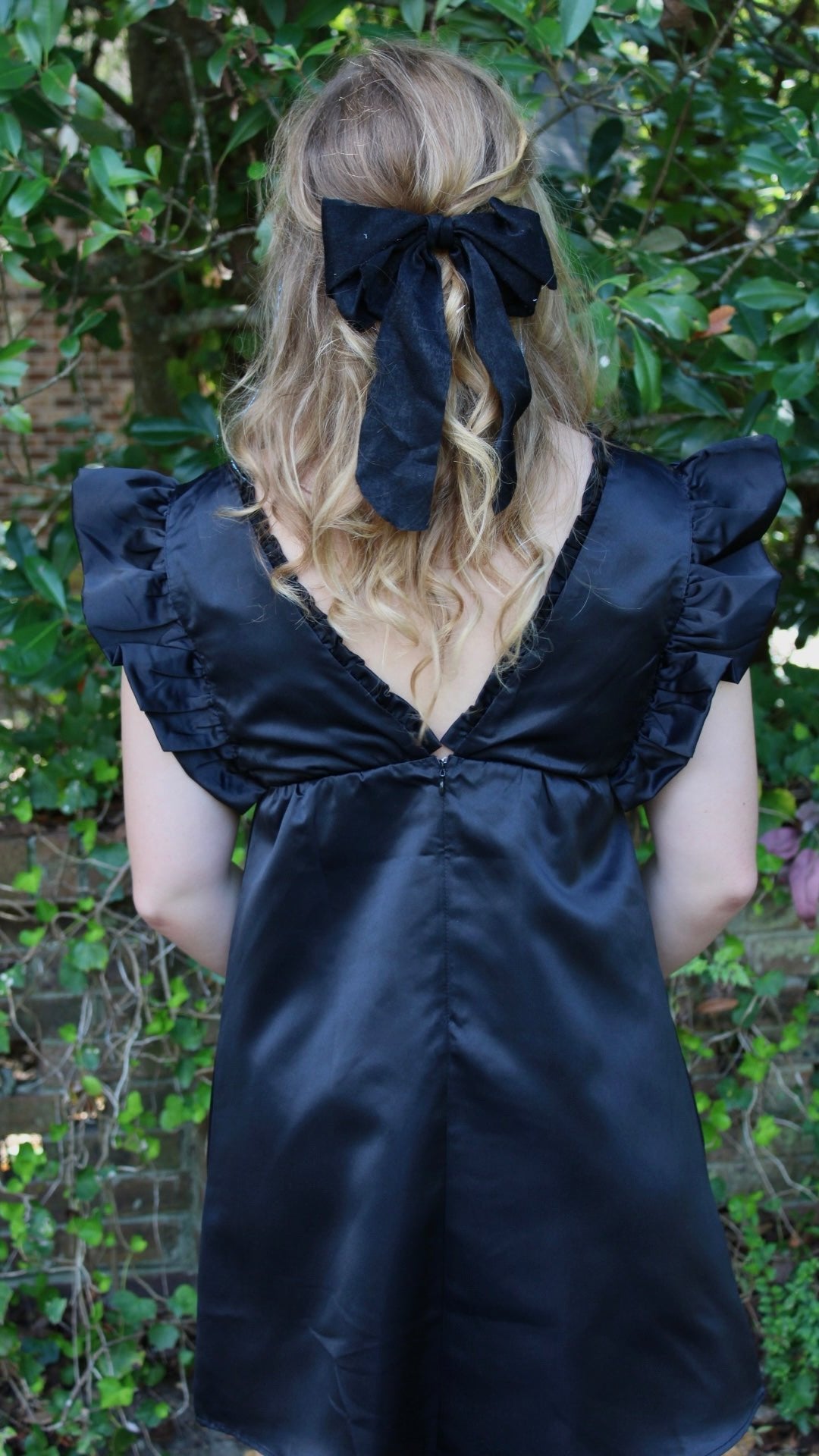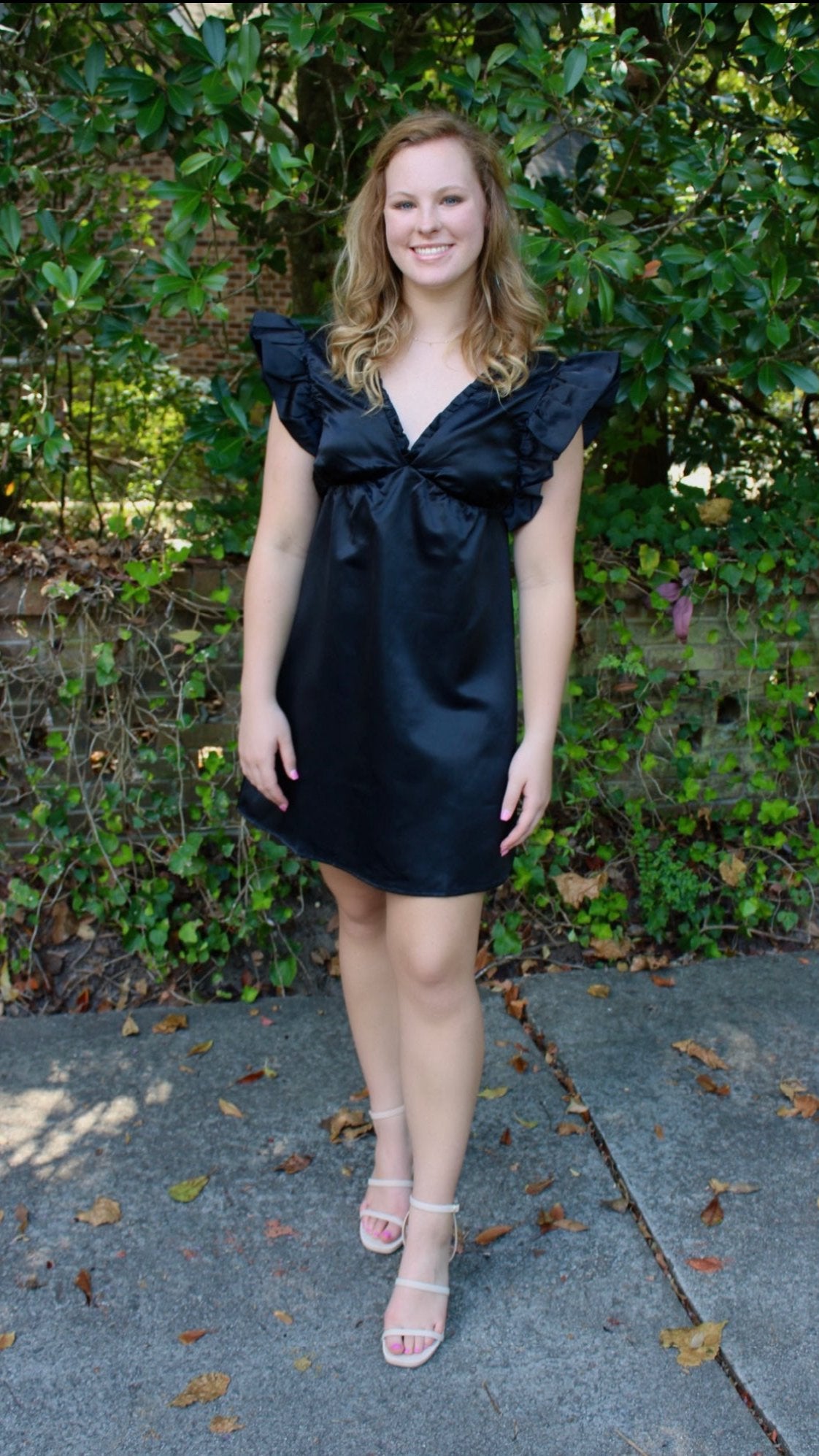 Indulge in the luxurious feel of the Caroline Mini Dress in Black. This sleek satin dress features ruffle sleeves that add a touch of femininity and elegance to your look. Perfect for a special occasion or a night out!