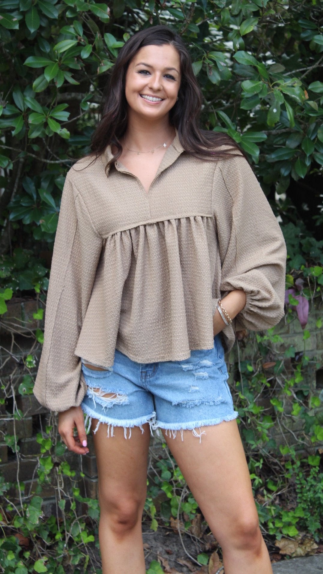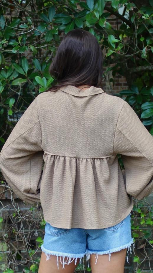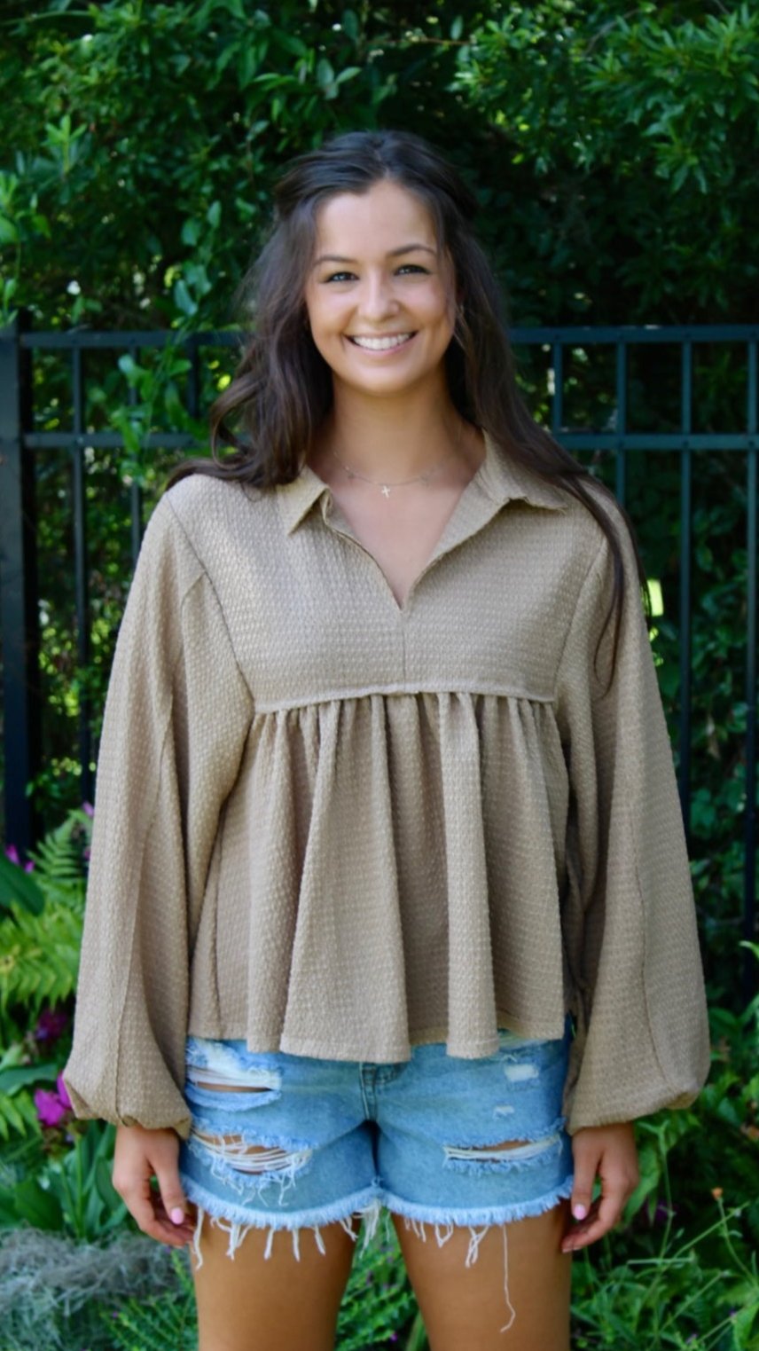 Introducing the must-have piece for your wardrobe: our tan top! Versatile and stylish, this top can be dressed up or down. With its flowy fabric and long sleeves, it's perfect for any occasion. Add this to your closet and experience effortless chic!