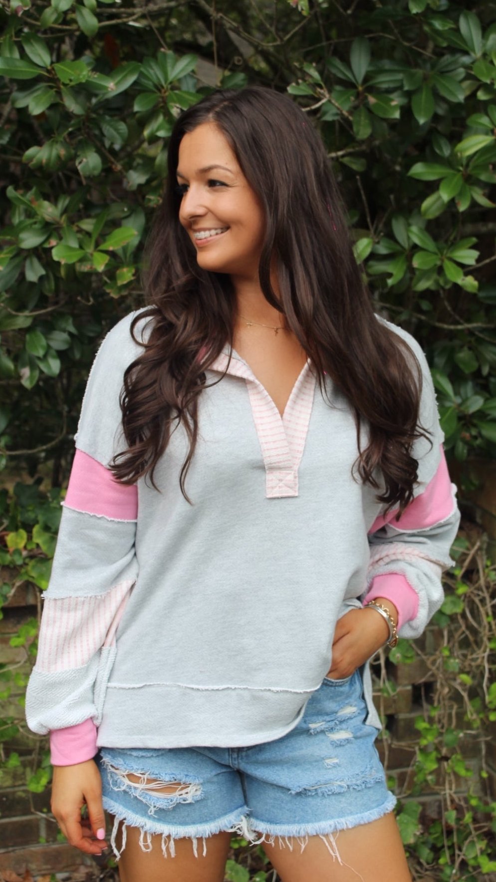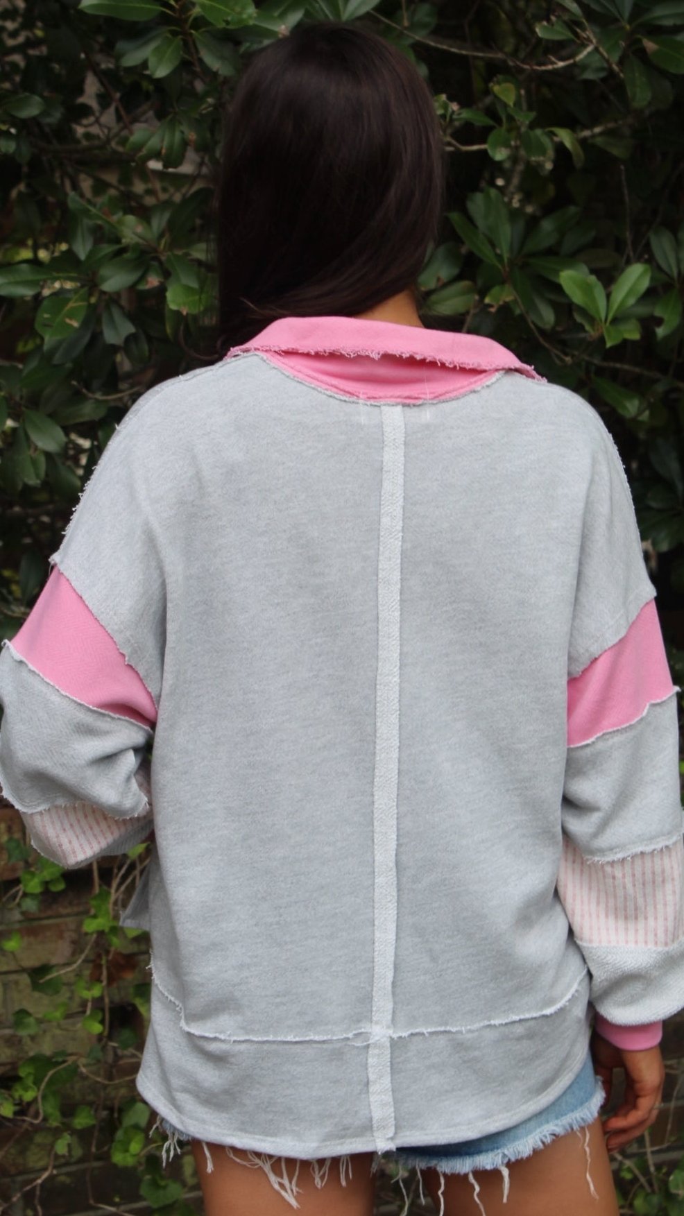 This Connor Top is the perfect addition to your loungewear collection. It features an oversize fit and a cozy pullover design in a stylish combination of gray and pink. Stay comfortable and trendy with this versatile top.