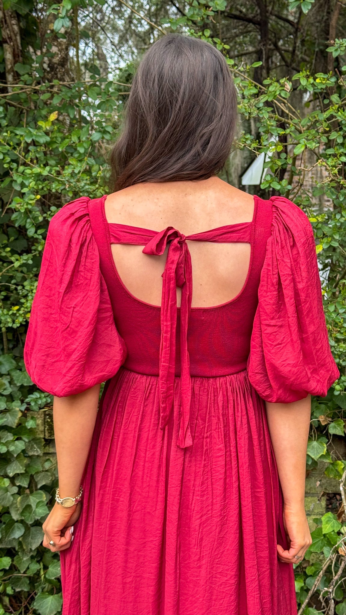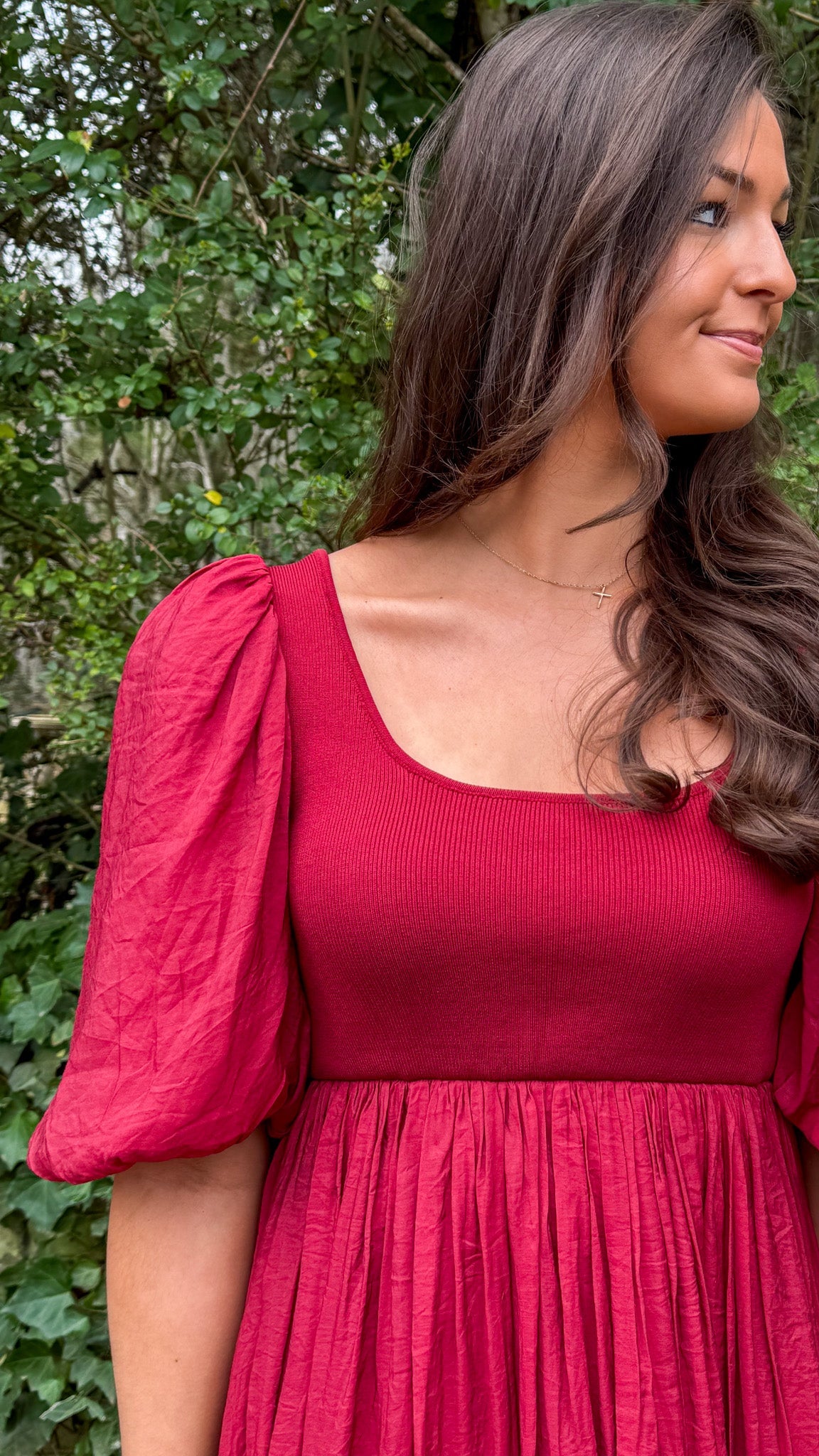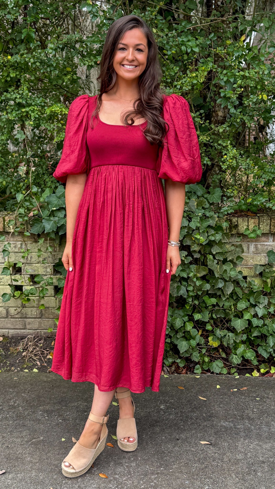 Cornelia Midi Dress – Burgundy with Puffed Sleeves