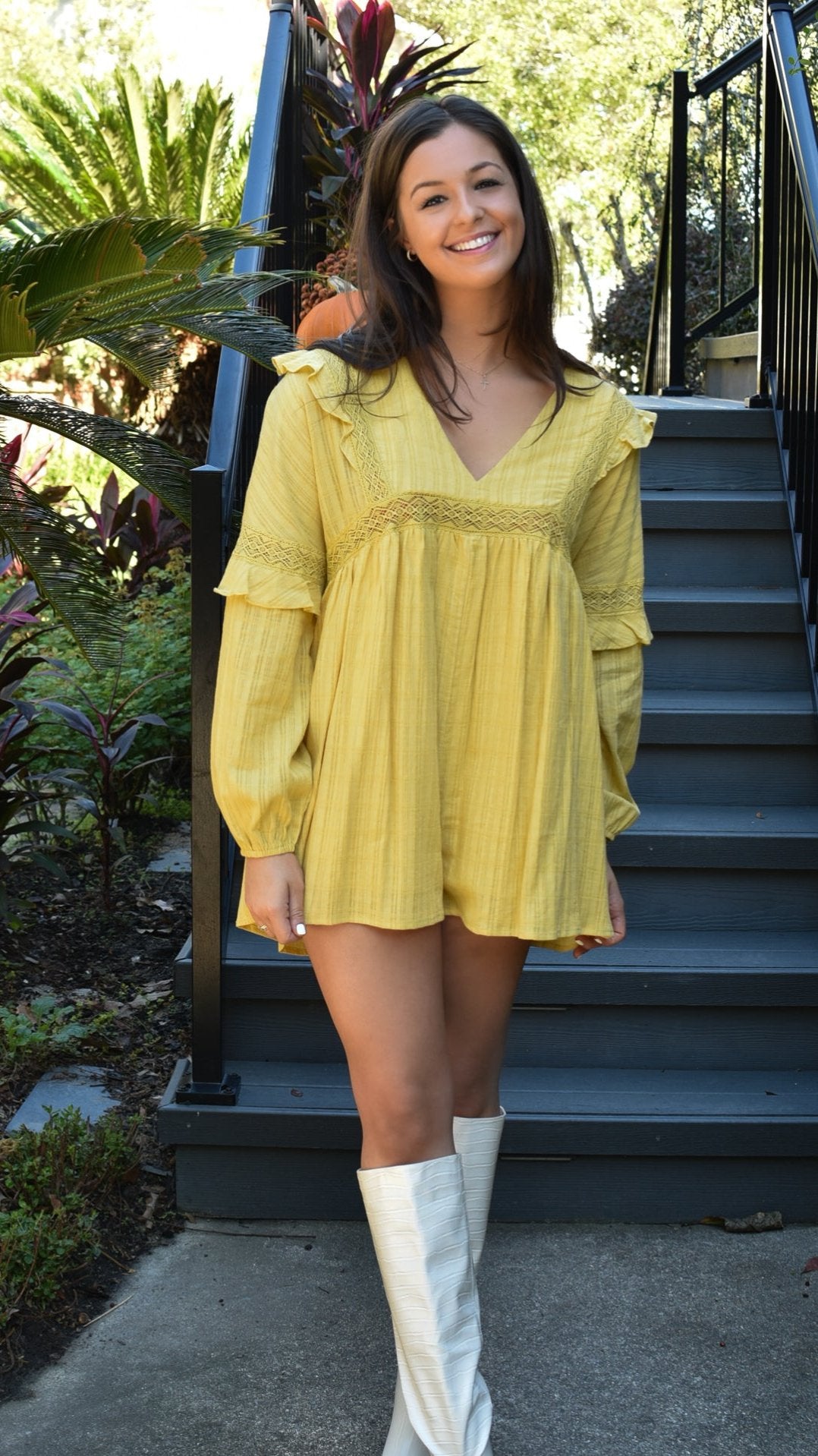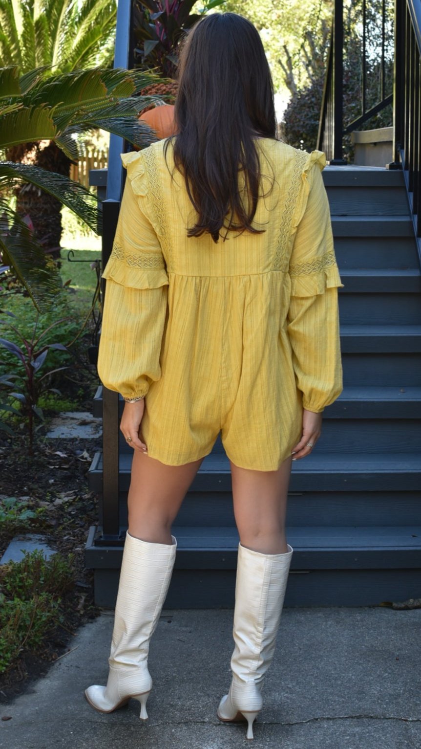 Explore the perfect combination of elegance and playfulness with our Courtney Romper. The v-neck design is accentuated with intricate lace and ruffle details, making it a stylish and comfortable choice for any occasion. Add a touch of sunshine to your wardrobe with our vibrant yellow color option.