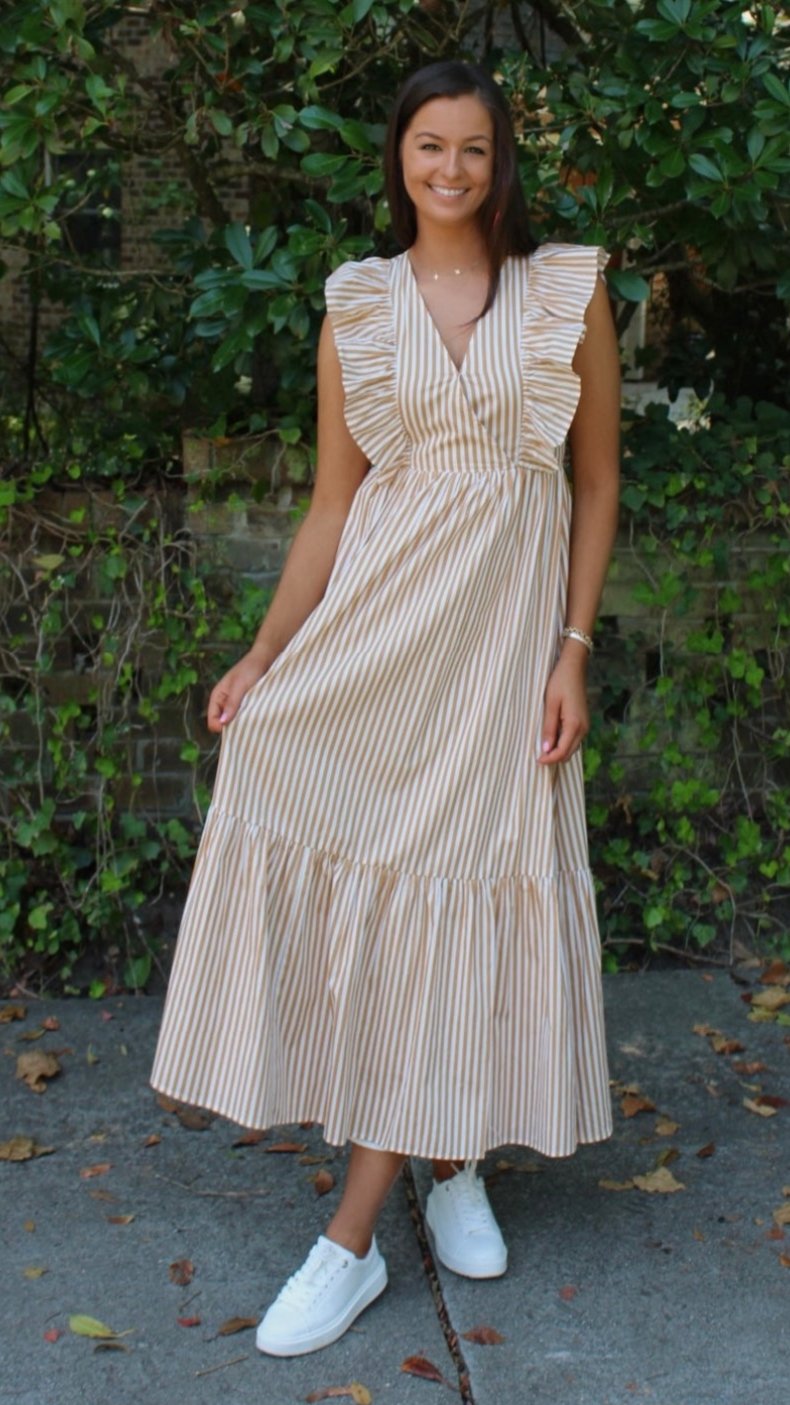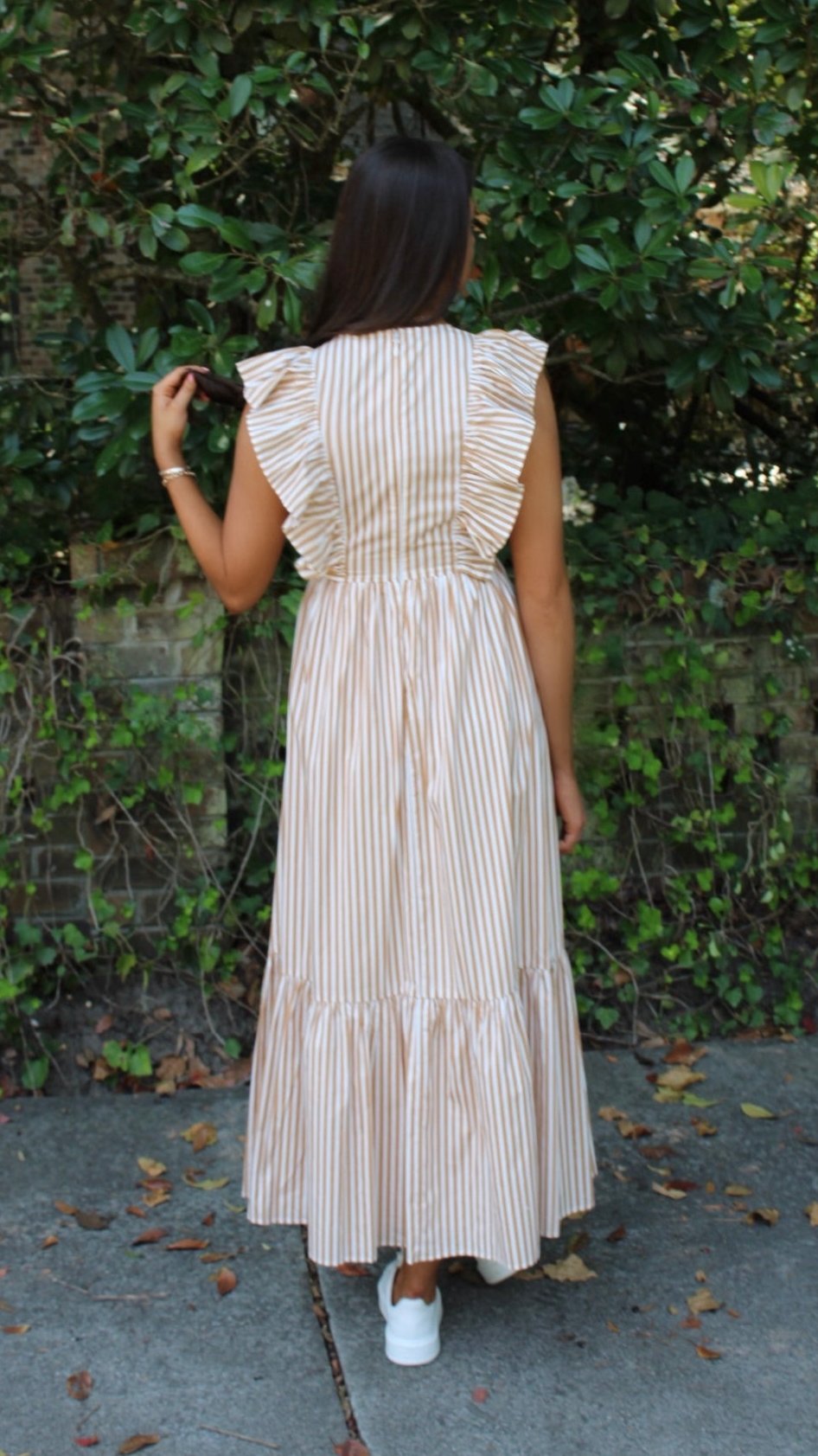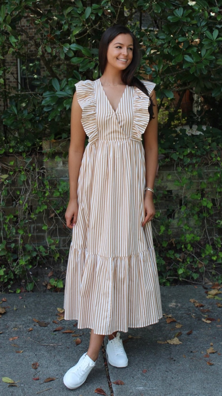 Elizabeth Midi Dress - Taupe Stripes - Ruffle Detail Around the Neckline for Added Charm