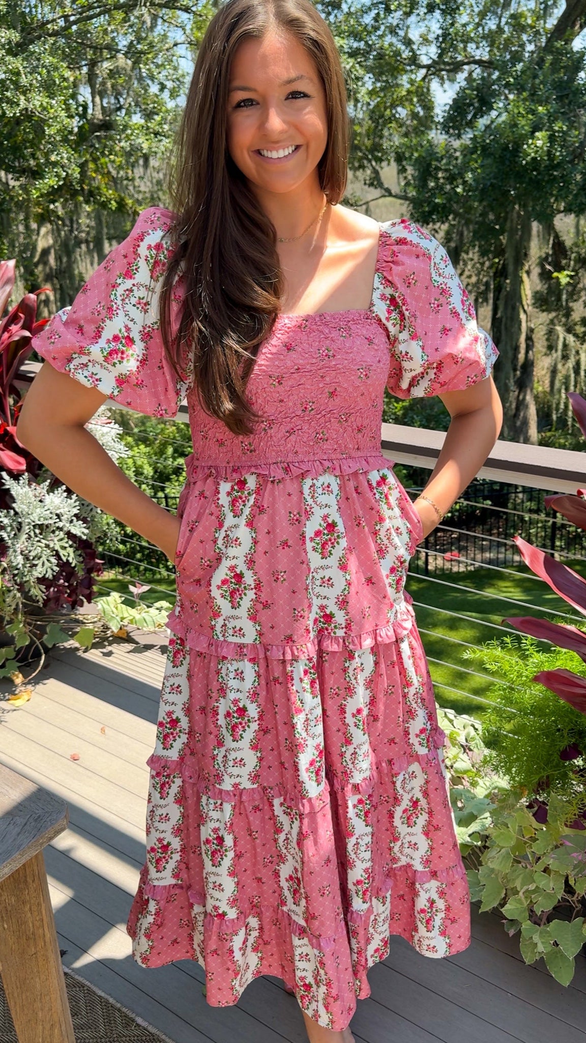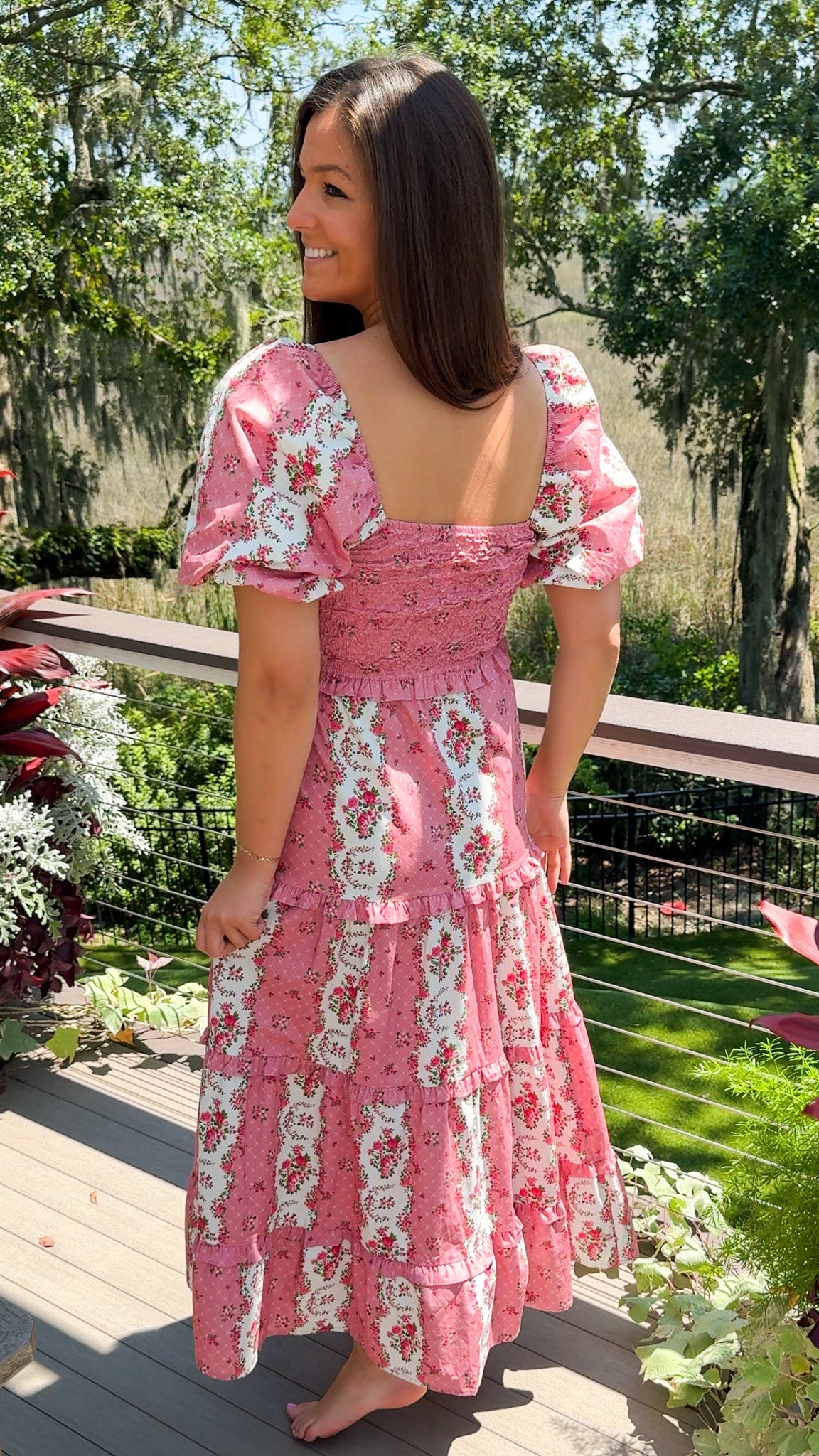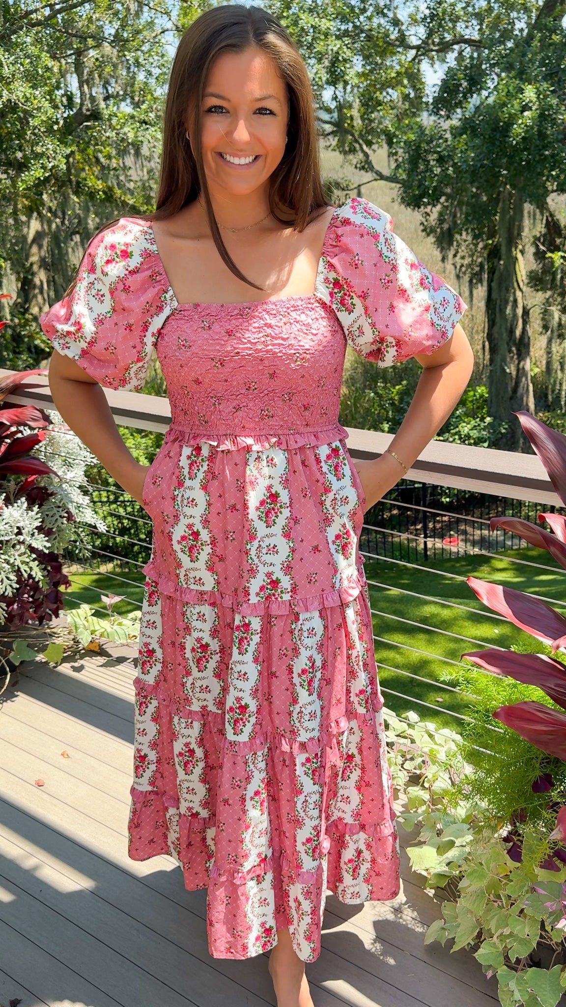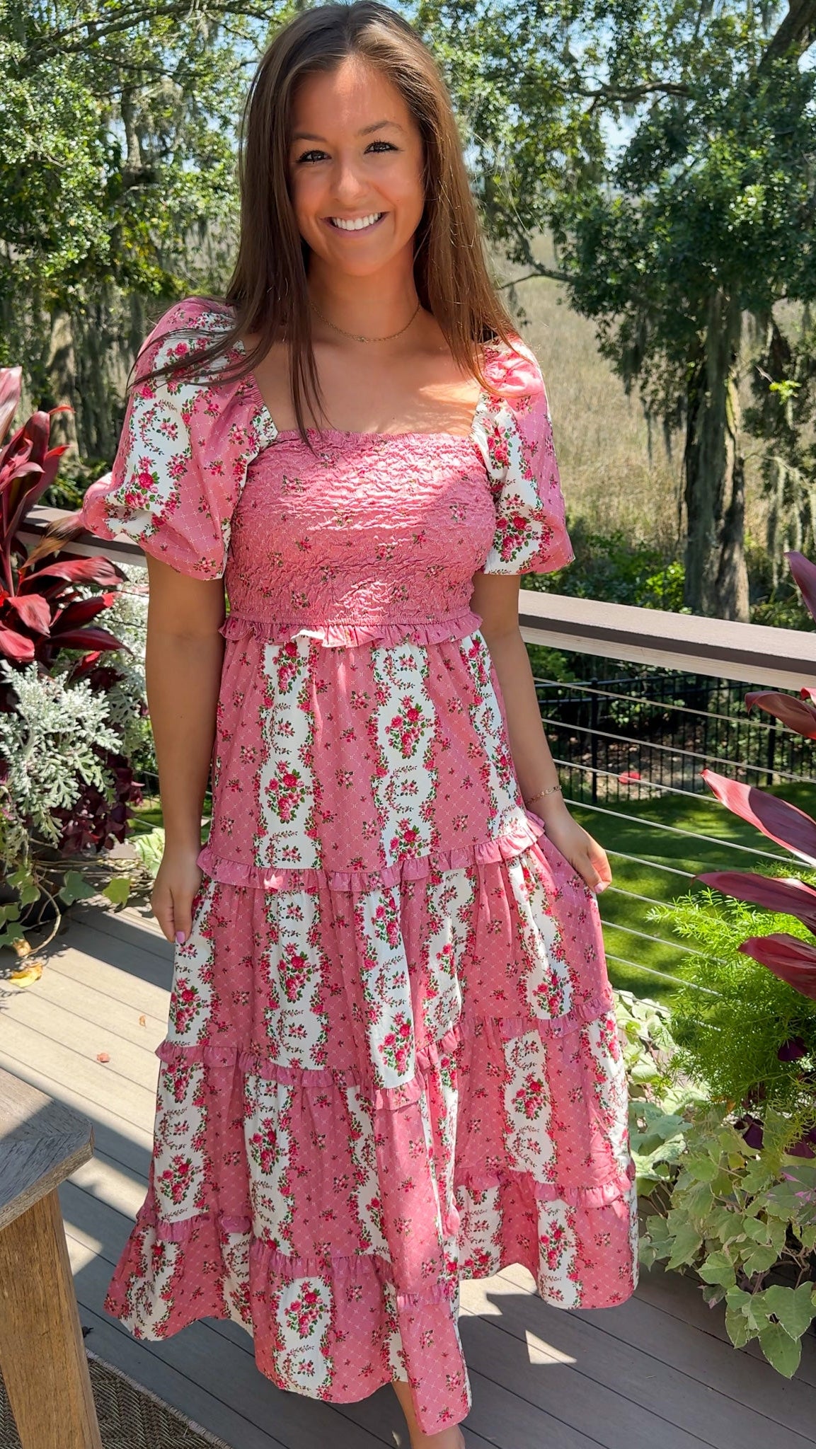 The Felicity Floral Maxi Dress brings effortless romance to your pre-fall wardrobe. With soft mauve and pink florals, flowing tiers, and playful bubble sleeves, it’s the dress you’ll reach for when you want to feel feminine, confident, and season-ready — no thinking required.