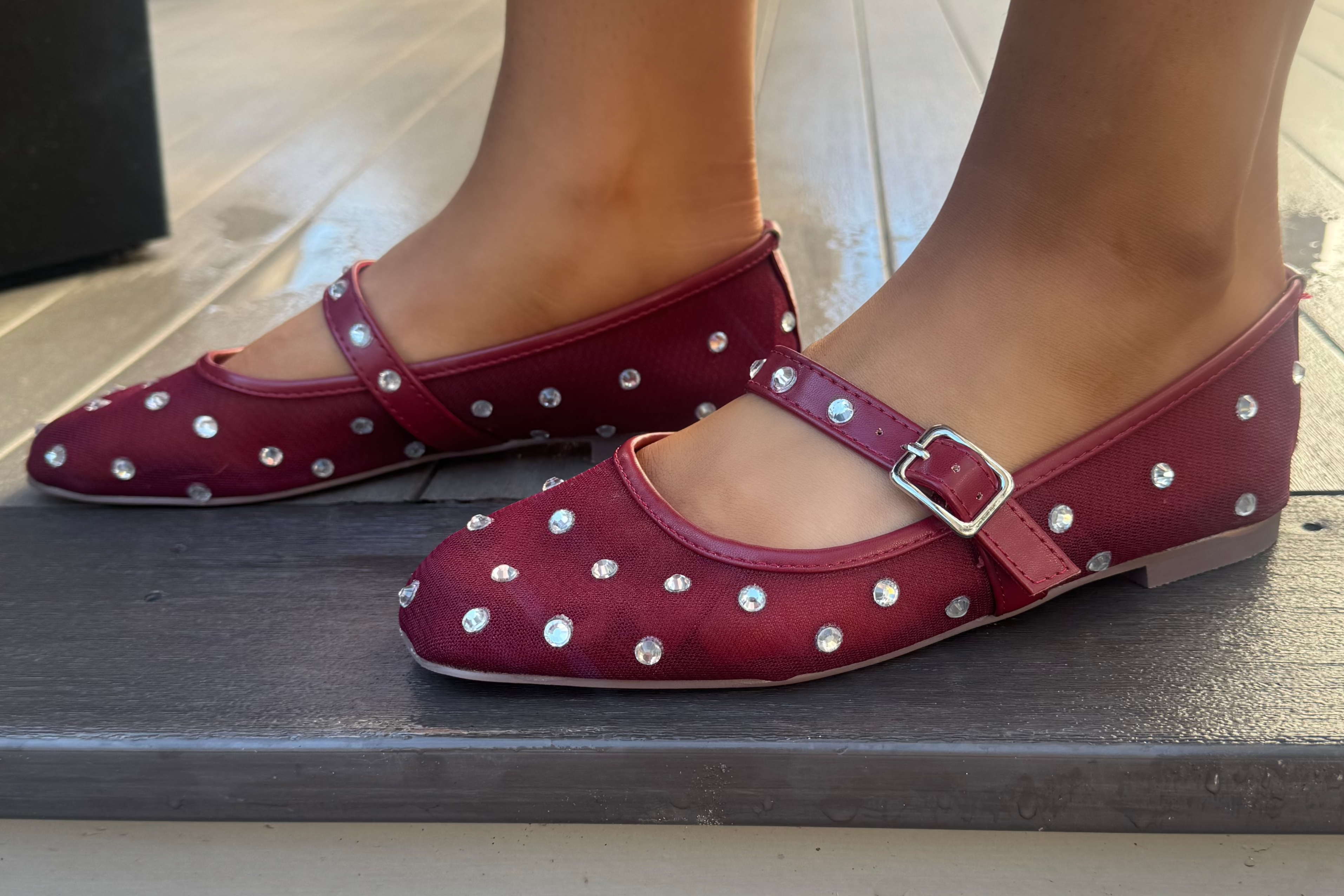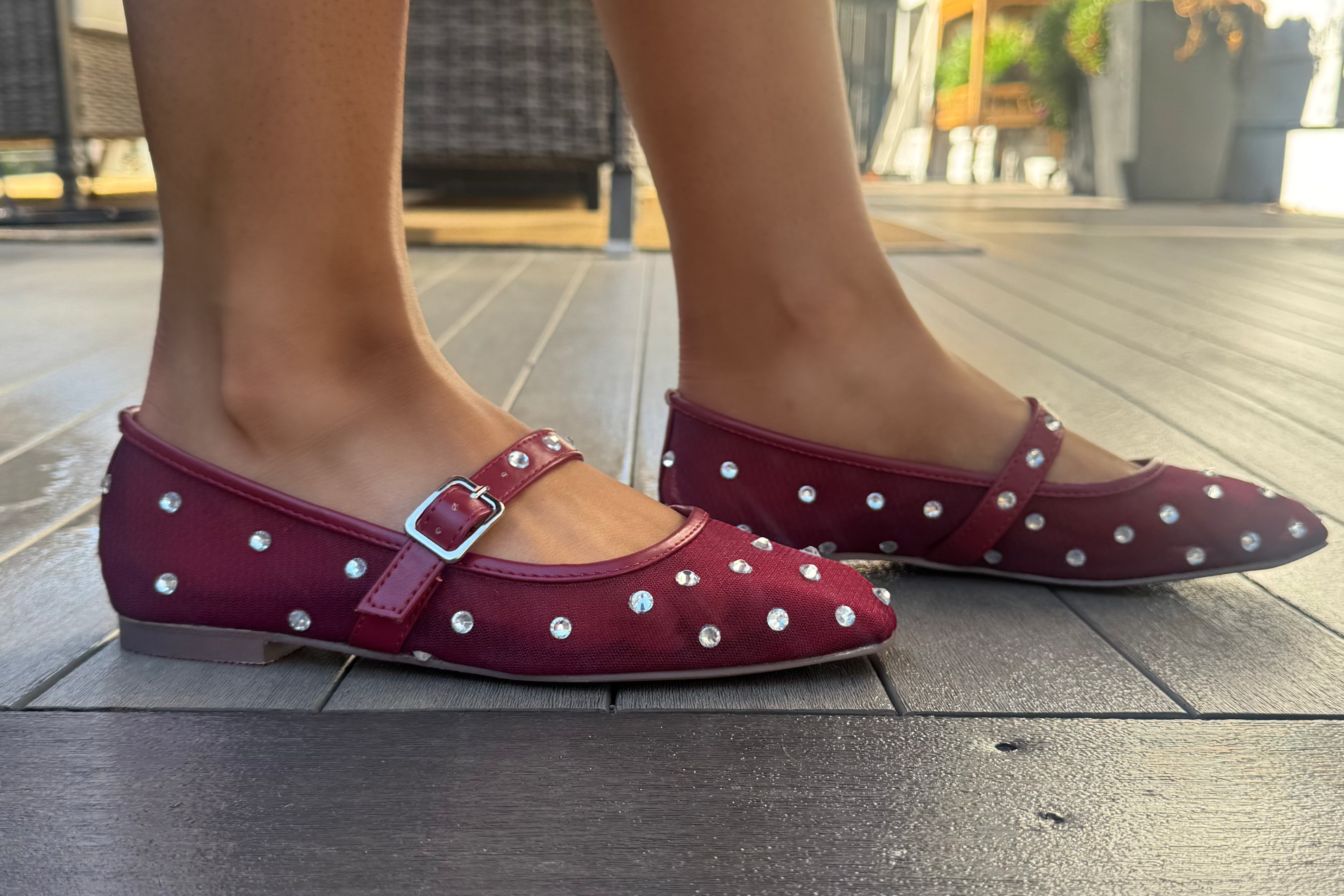 Elevate your style with our Gracie Mesh Flats in Wine! These cute flats feature mesh detail and sparkling rhinestones for a touch of glam. Perfect for any occasion, these flats will add a touch of elegance to your outfit. Stand out and shine with the Gracie Mesh Flats!