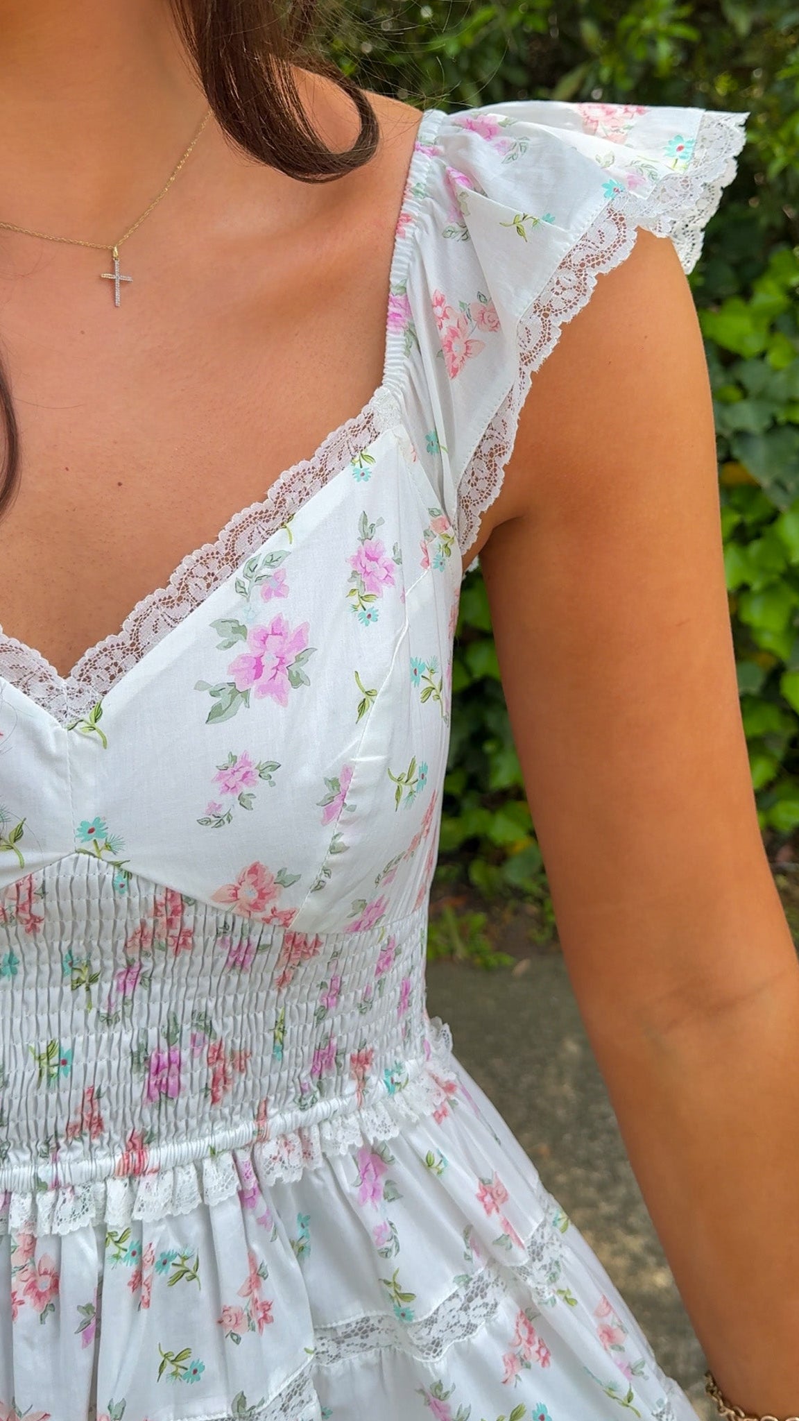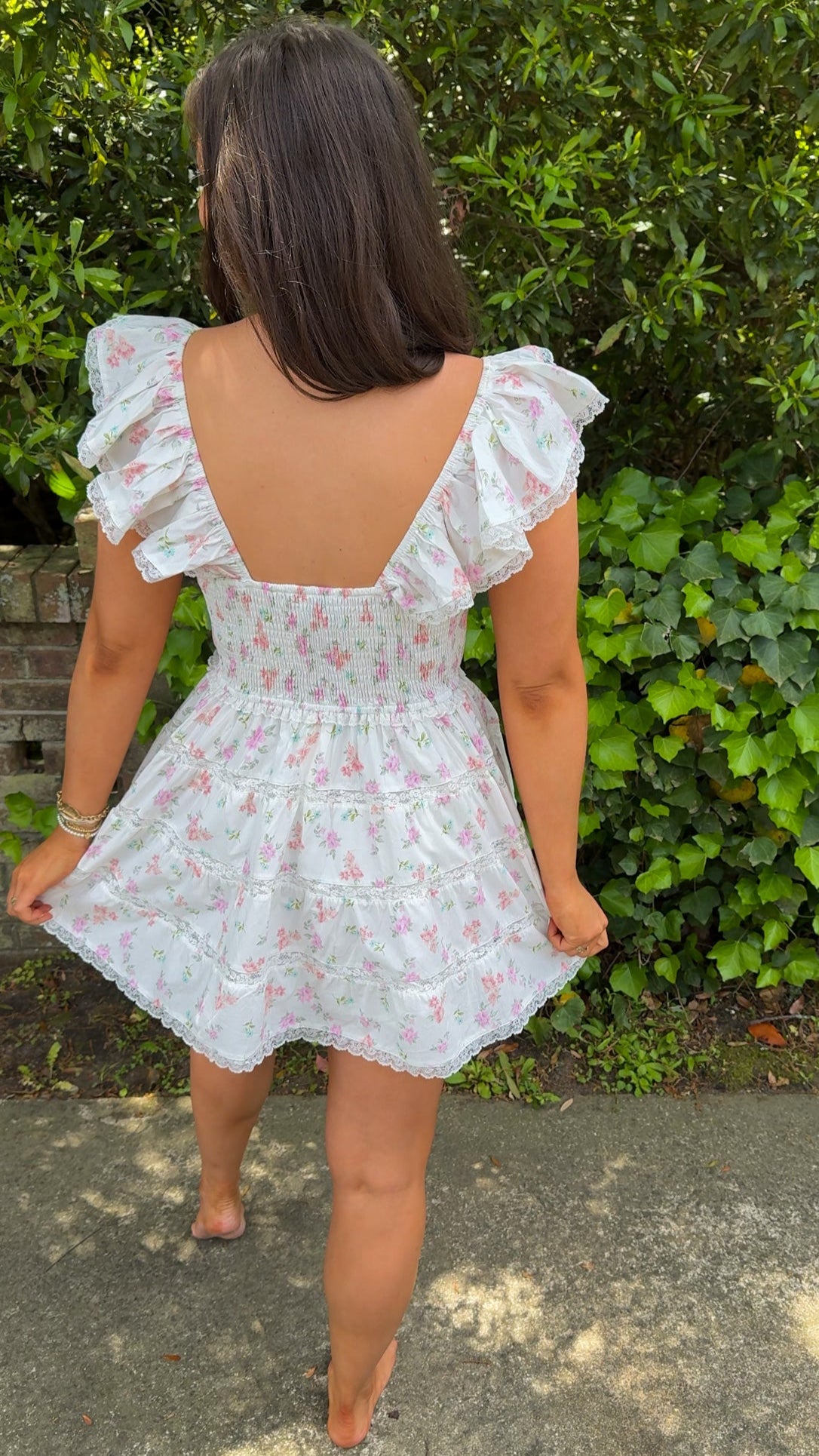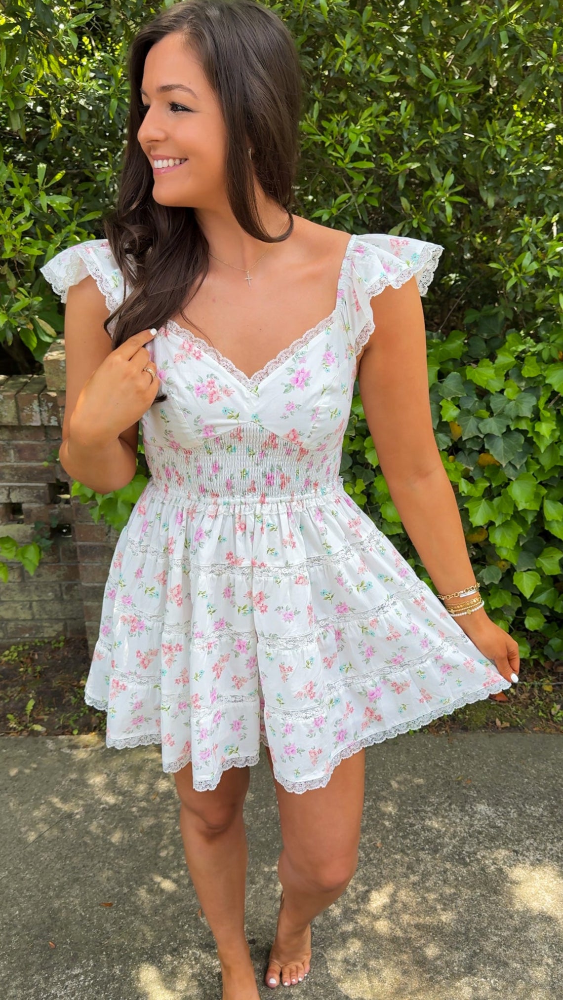The Isla Dress is a beautiful tiered mini dress adorned with a soft floral print in pink multi hues. Its smocked waistband ensures a flattering fit, while the ruffle lace trim sleeves add a sweet, vintage-inspired touch. The tiered skirt, accented with lace trim detail, enhances the dress’s playful and romantic vibe. The fully lined design ensures comfort, making it the perfect choice for a variety of occasions.