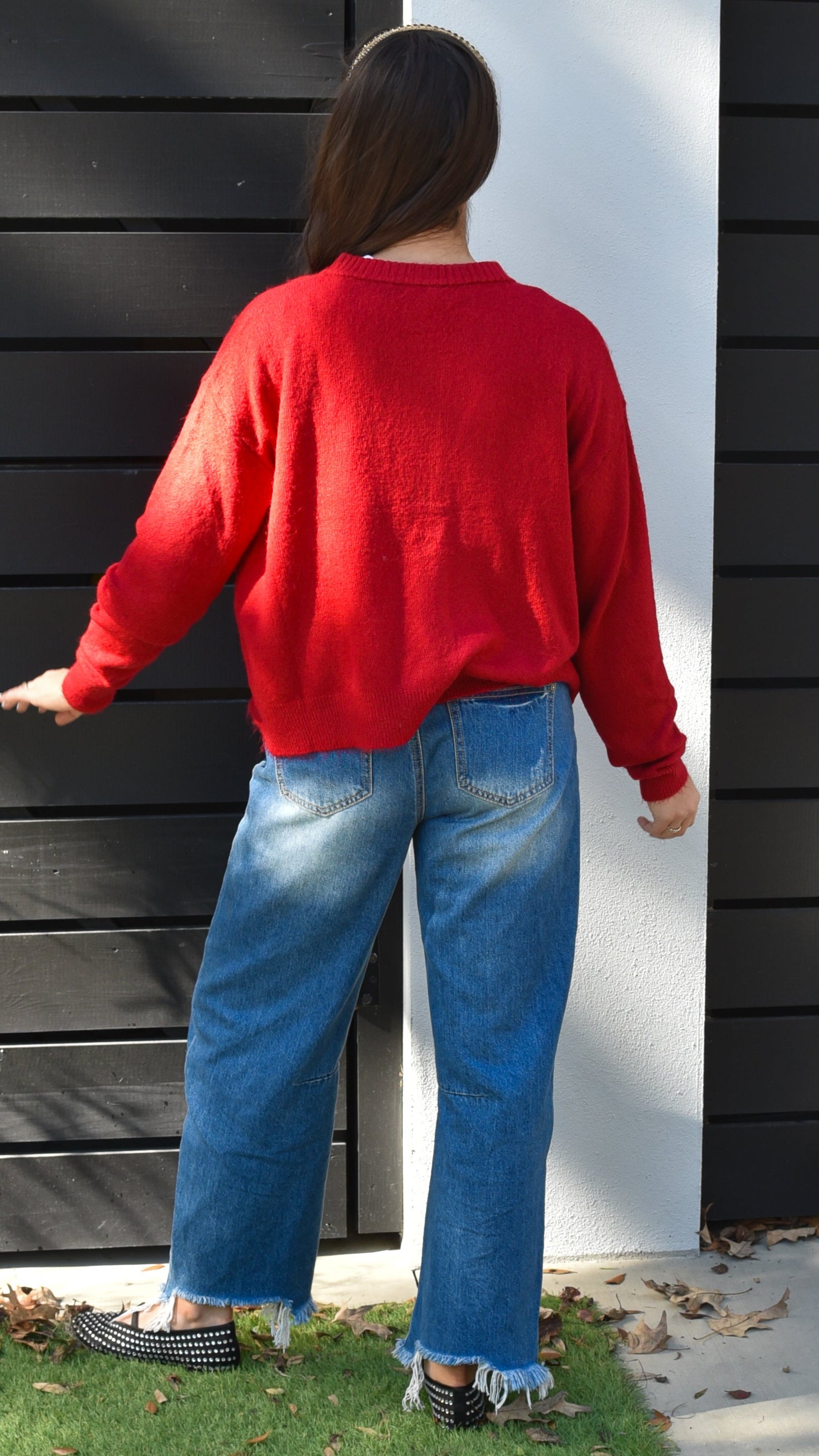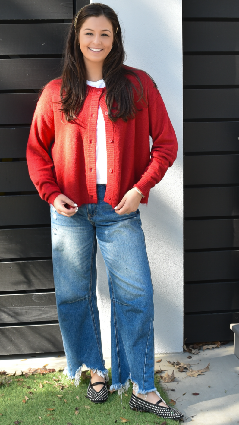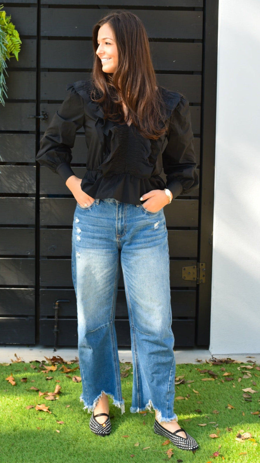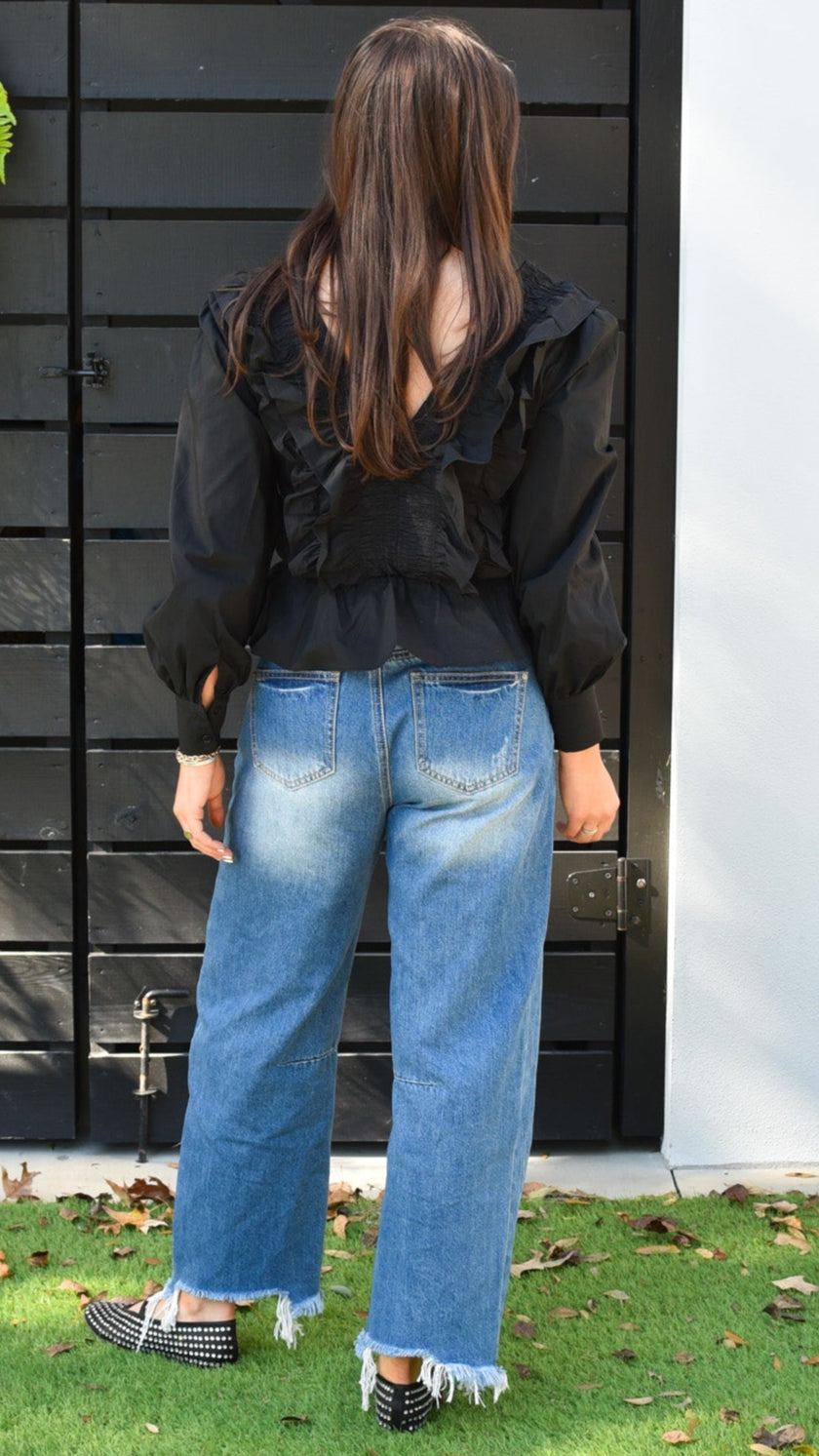 Elevate your denim game with our high rise distressed barrel jeans in medium dark wash. These jeans offer a loose fit and a trendy distressed look, perfect for any occasion. Show off your style confidently and comfortably!