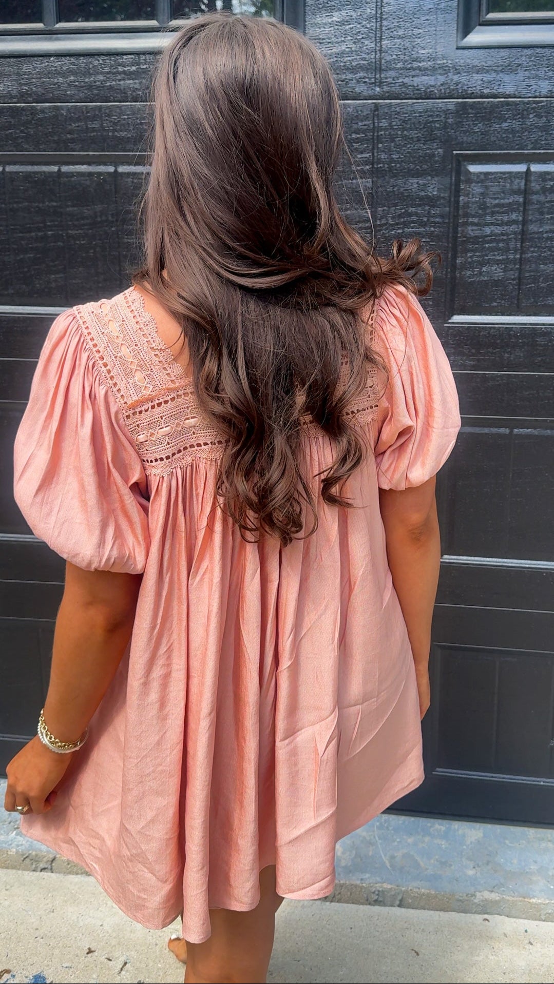 Nellie Dress – Blush Linen Viscose Mix Dress with Eyelet Lace Trim