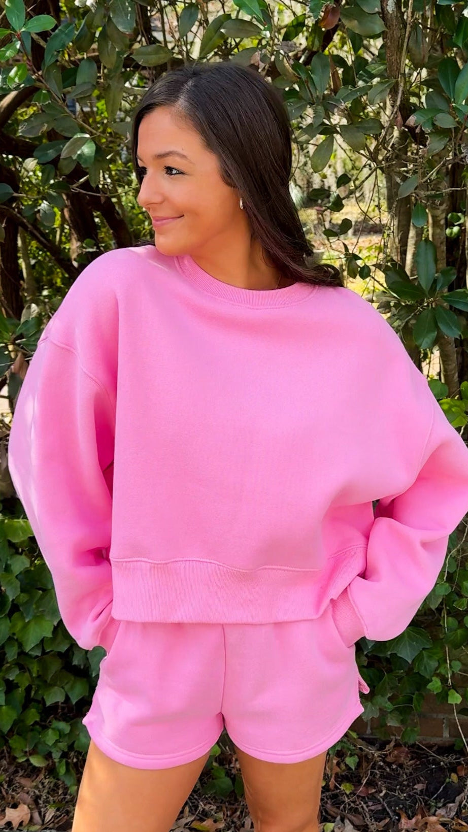 Made from soft and breathable fabric, the Rosie Sweatshirt features a classic round neck and trendy dropped shoulders for a laid-back, oversized look. The delicate pink color is fresh and feminine, perfect for pairing with the matching Rosie Shorts or your favorite denim. This sweatshirt offers both warmth and style, making it an essential piece for effortless, casual days.