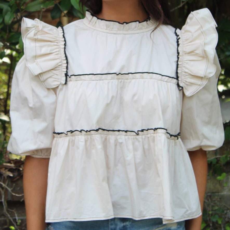 Elevate your wardrobe with our Scarlett Ruffle Top in Ivory. Featuring a beautiful ruffle design with black detailing and a flowy bodice, this long sleeve top is perfect for any occasion.