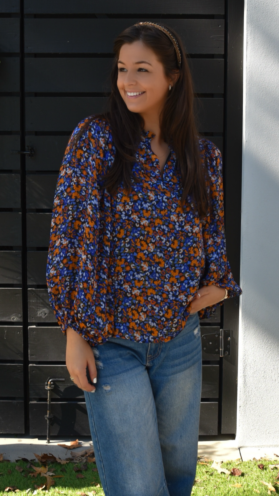 The Sierra Top is a must-have for your wardrobe! This beautiful blue and rust floral print top will elevate any outfit with its ruffle trim split neckline and long balloon sleeves. Its relaxed fit ensures comfort and versatility - perfect to pair with any pants or denim jeans!