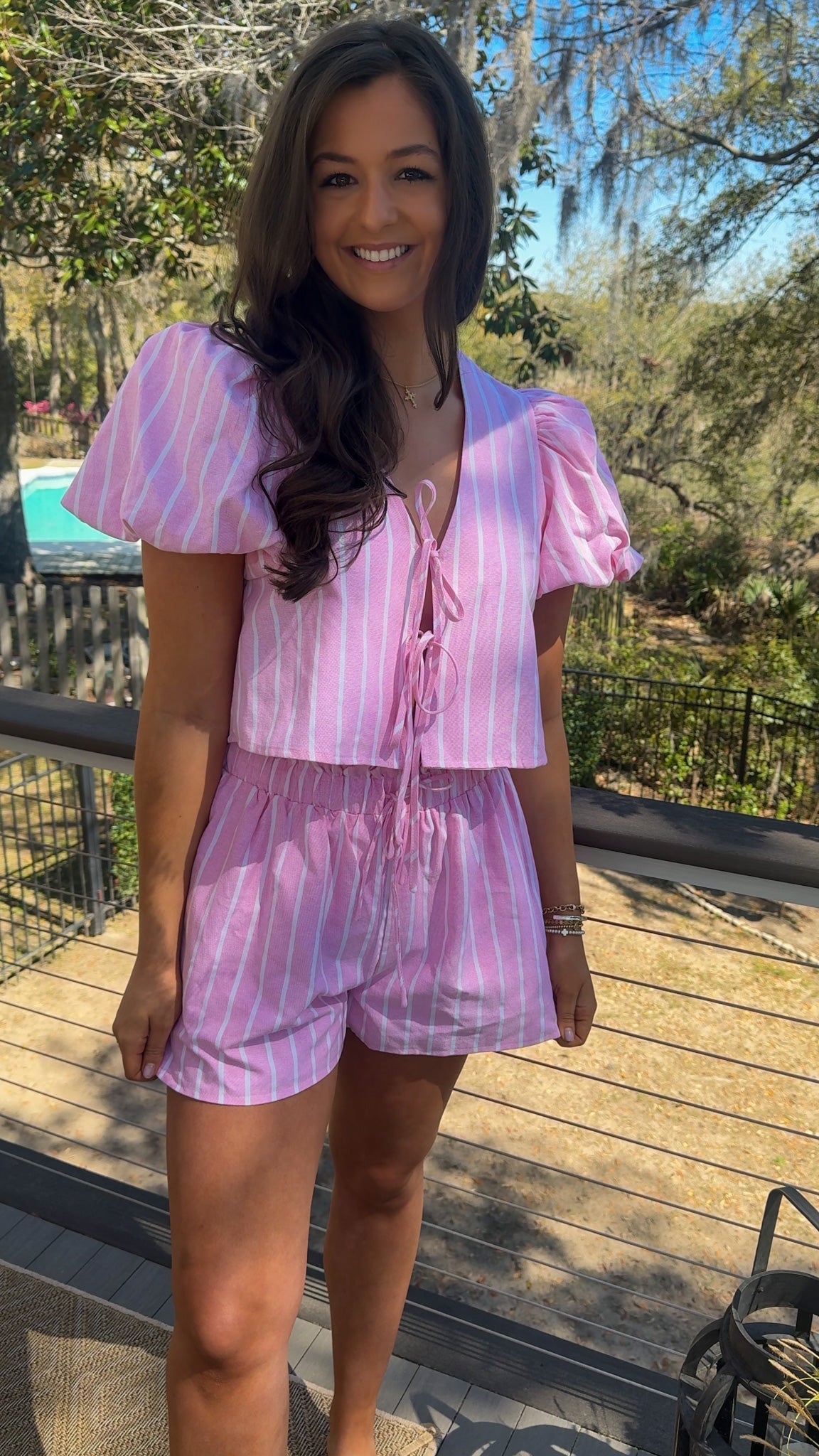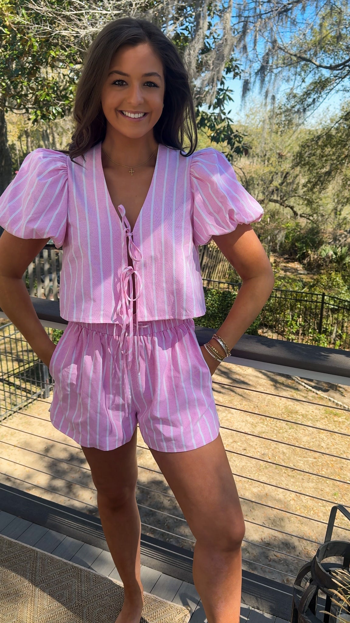 The Sophia Set features a beautifully striped blouse with short puff sleeves that add a touch of femininity. The matching high-waisted shorts come with an elastic waistband for a comfortable and flattering fit, while the double self-tie detail elevates the look with a refined, polished touch. Fully lined for all-day comfort, this lightweight set is your new go-to for a put-together yet effortlessly stylish outfit.