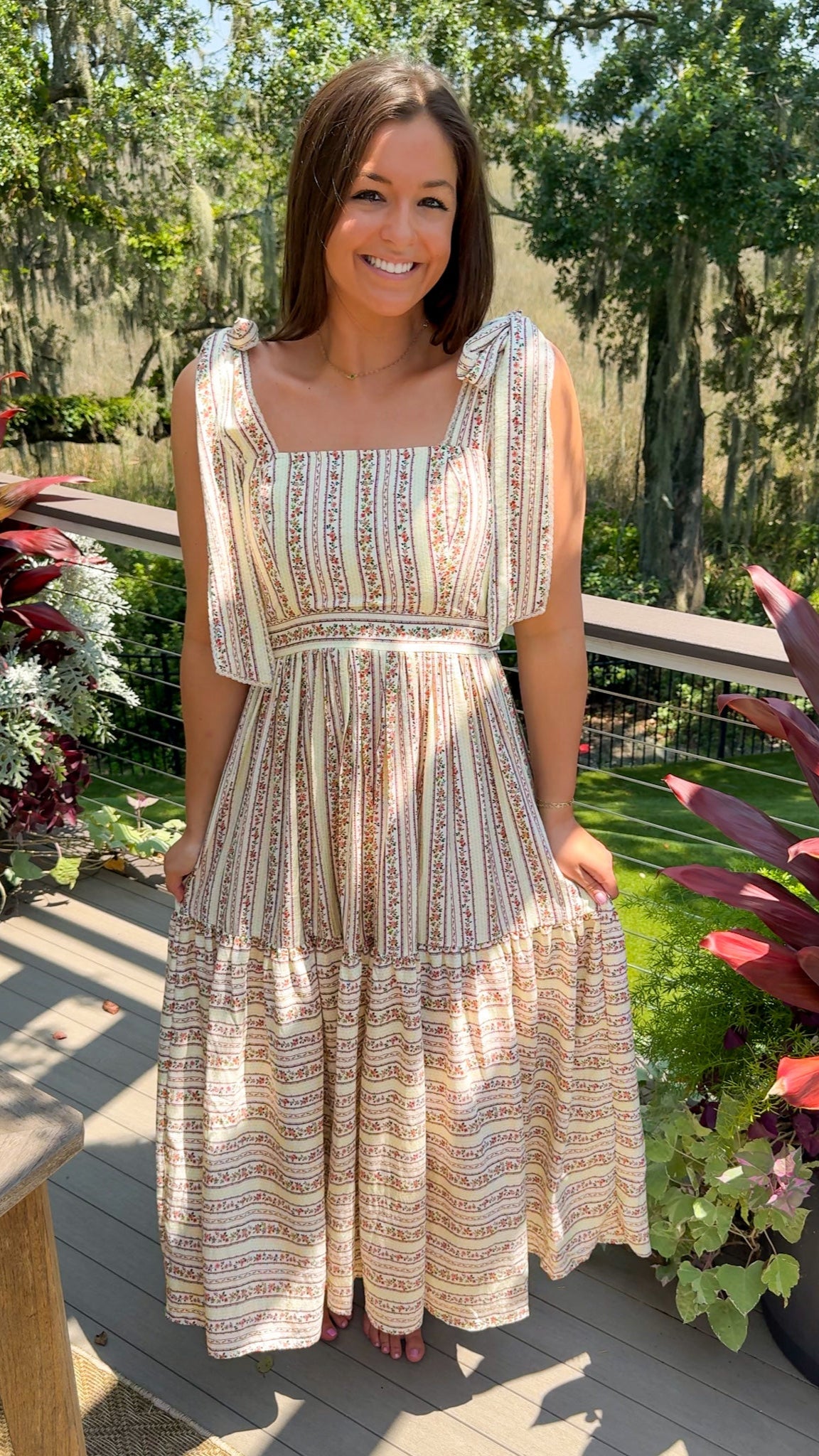 Willow Midi Dress – Tiered Floral Midi with Self-Tie Straps & Lace Trim Details