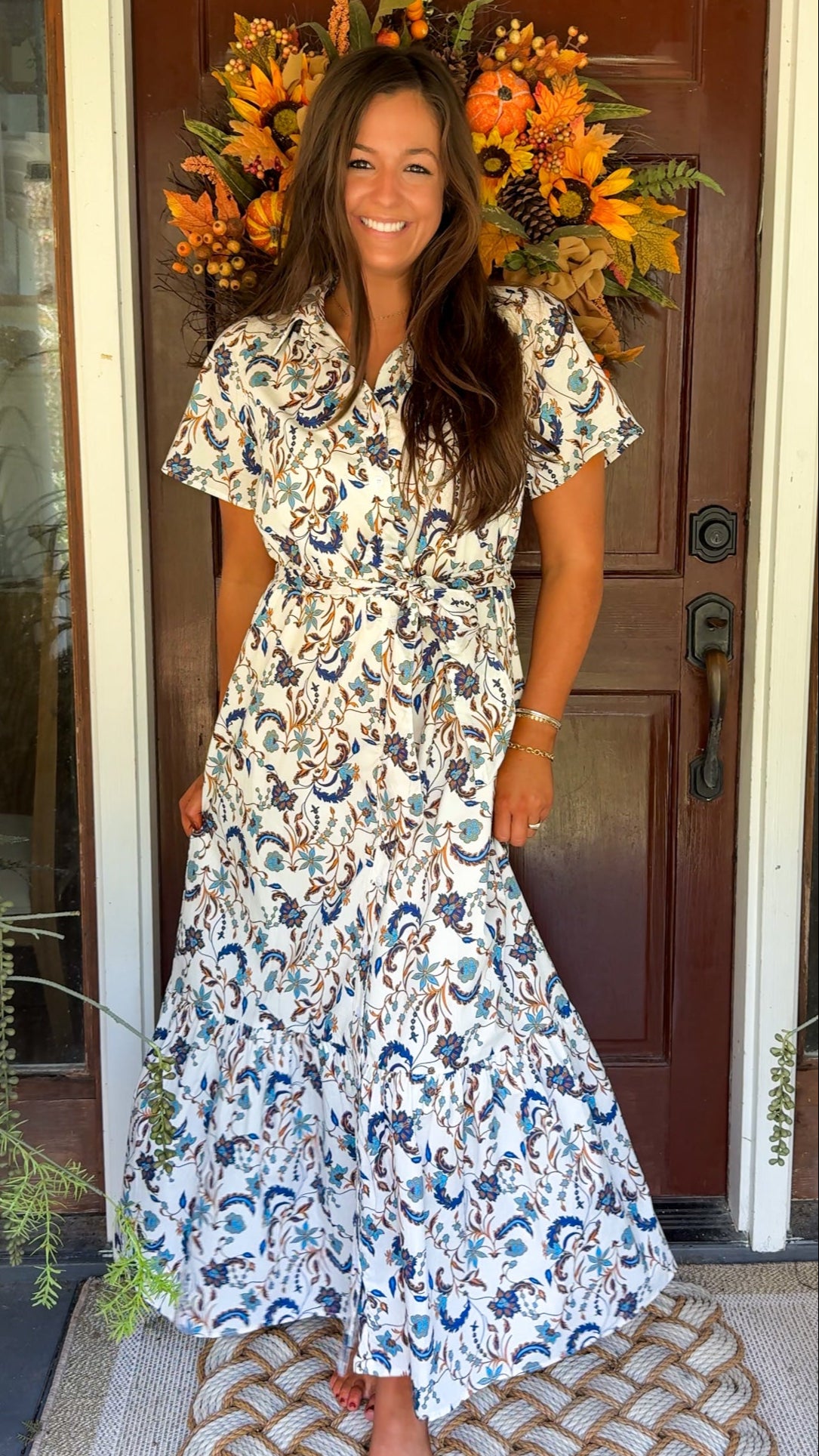 Designed in an off-white base with soft blues and earthy browns, the Everly Maxi Dress balances structure and femininity. Short sleeves and a collared neck add tailored appeal, while the detachable waist tie cinches your shape for a flattering silhouette. The button-down front creates styling versatility — wear it fully closed for a classic look, or leave a few buttons undone for a relaxed vibe. Finished with side pockets and a lightweight lining, this maxi is as practical as it is beautiful.
