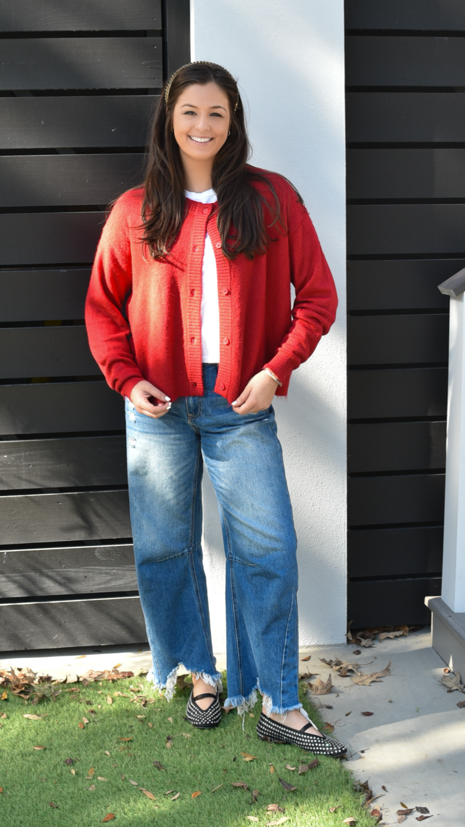 Introducing the Patty Cardigan in stunning red, the must-have addition to your wardrobe. Made from ultra-soft material, this cardigan will be your go-to piece for both comfort and style. Don't miss out on this essential piece!