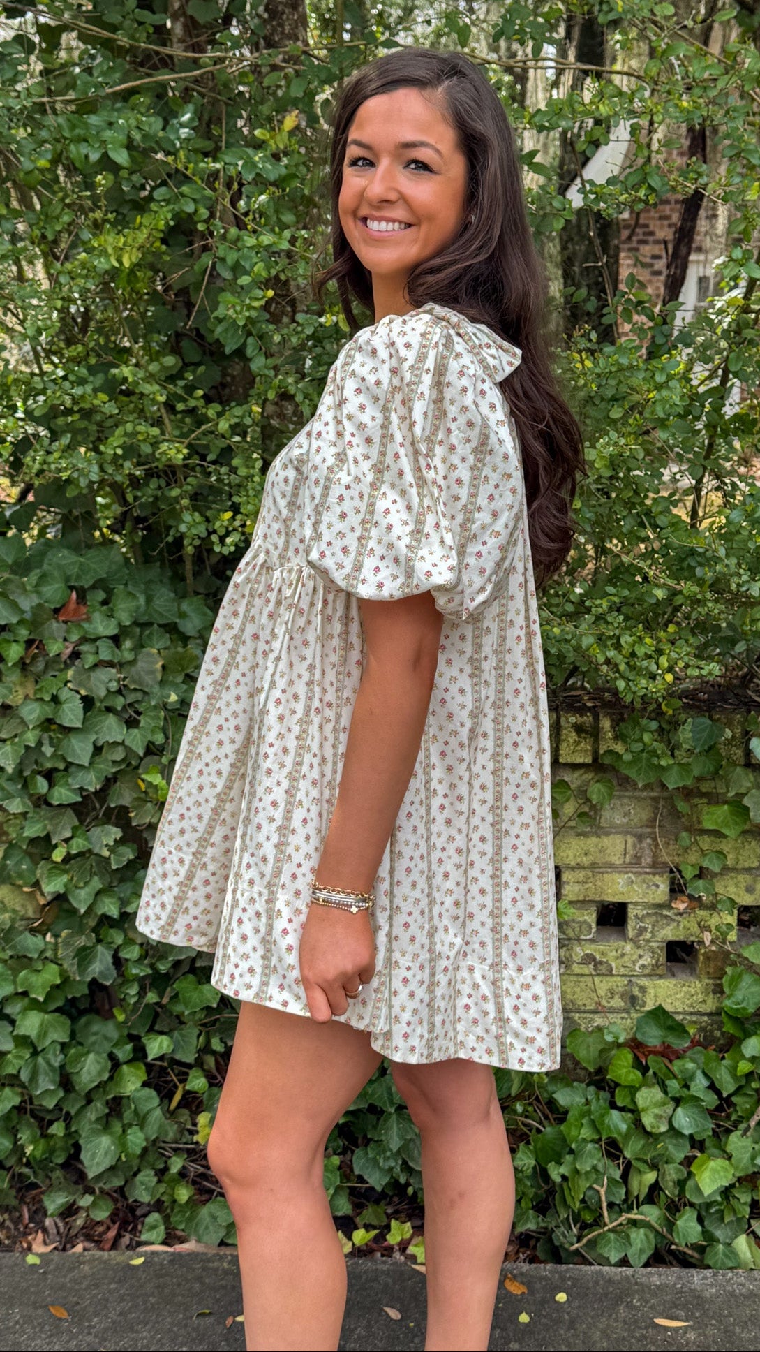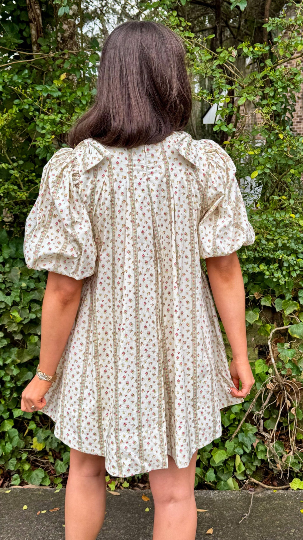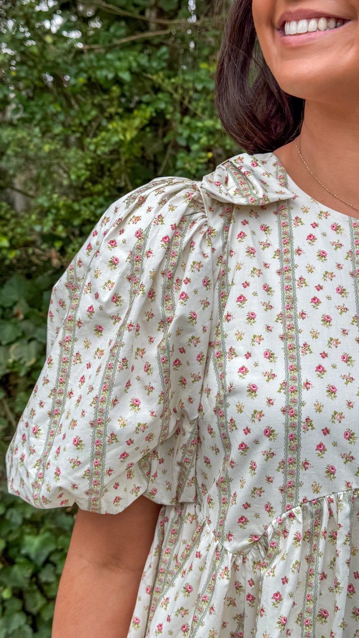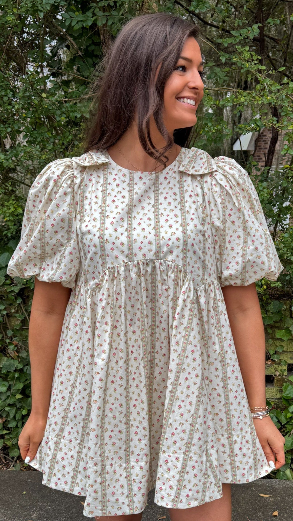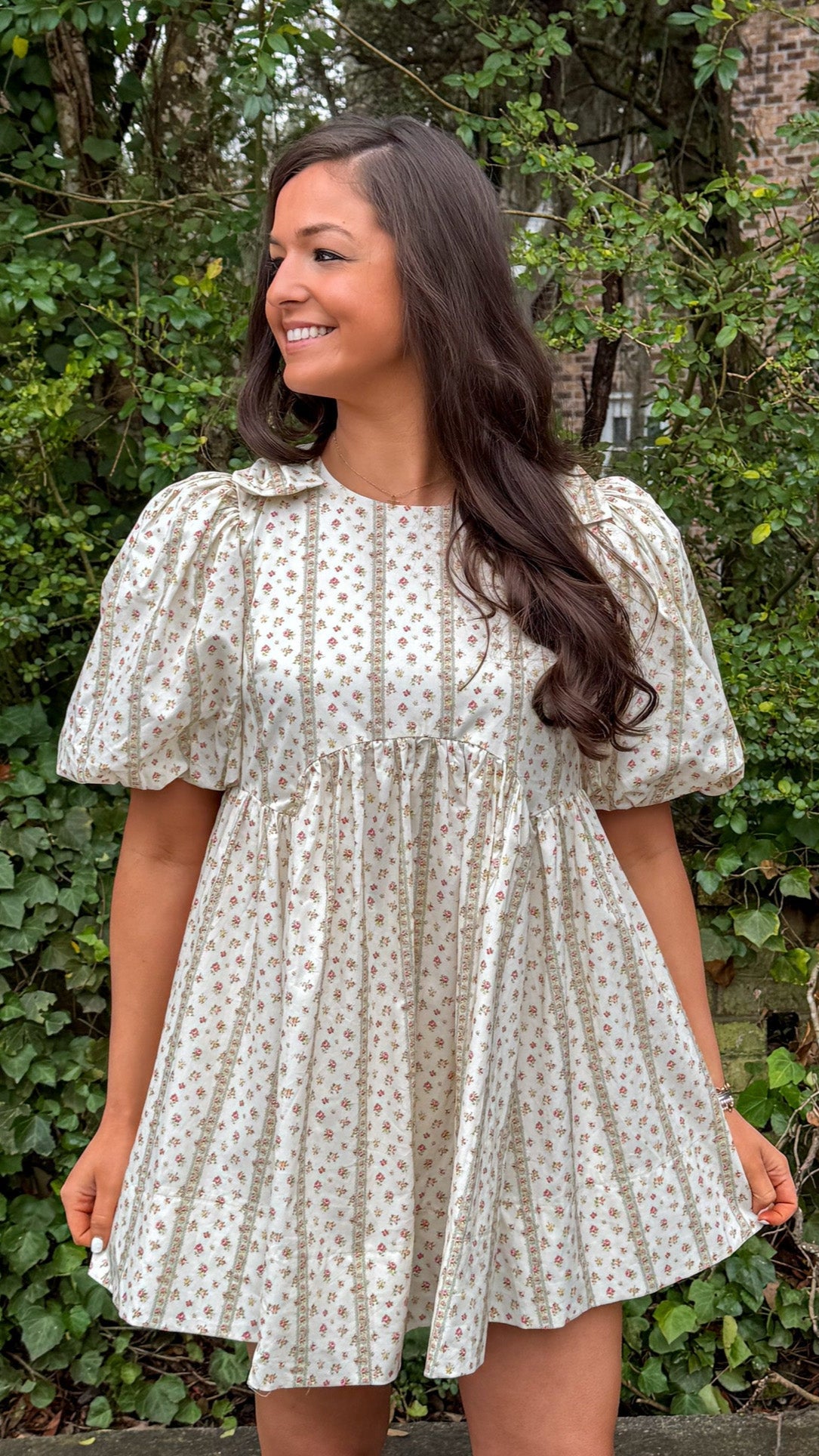Amelie Dress – Cream Babydoll Dress with Striped Floral & Shoulder Bows