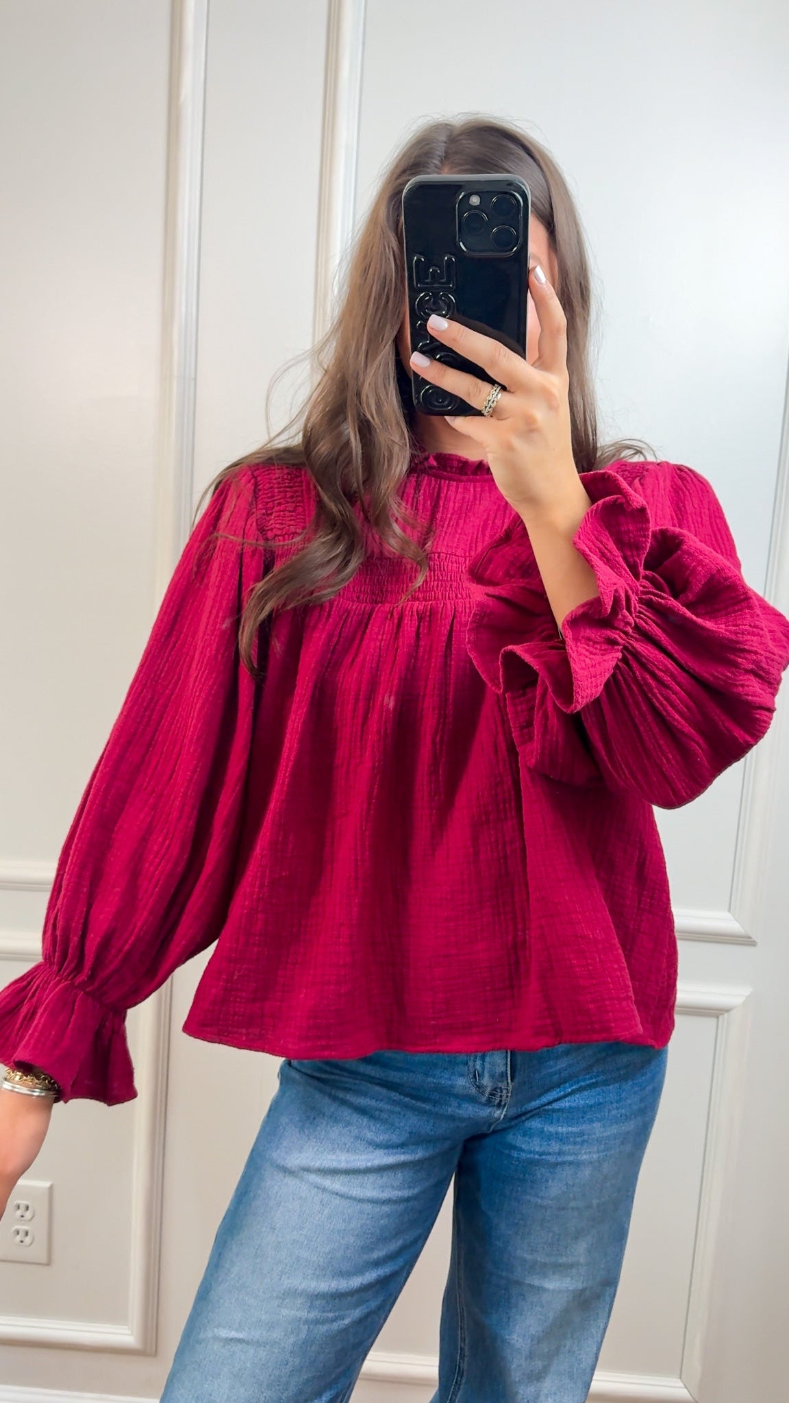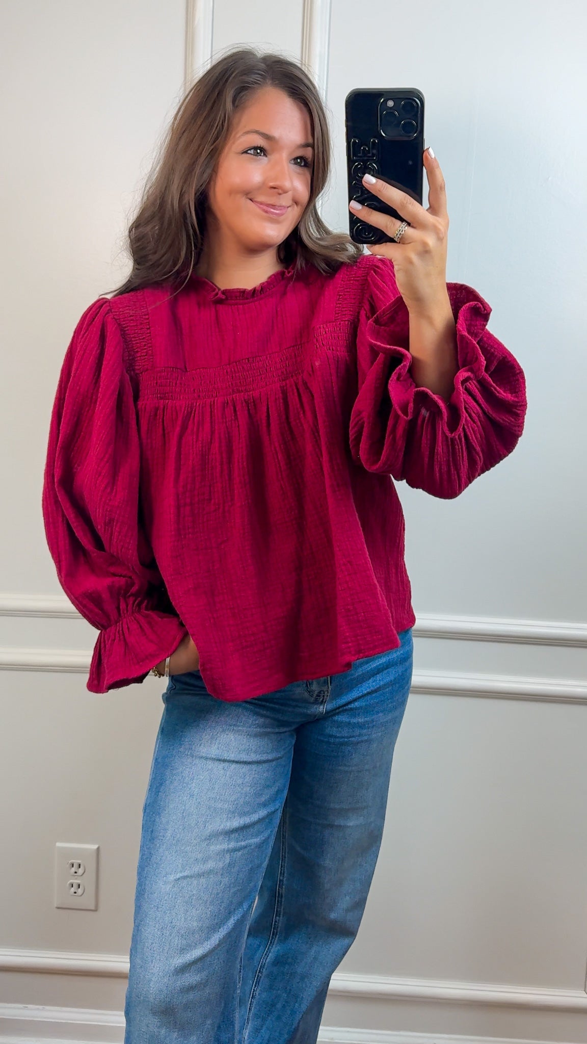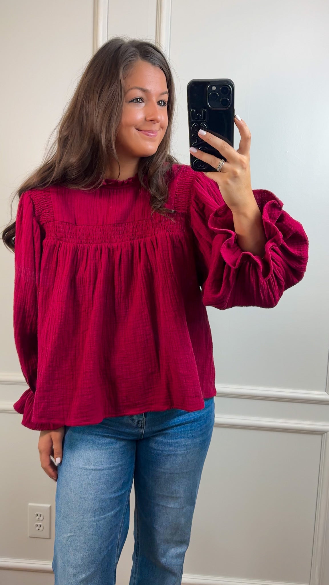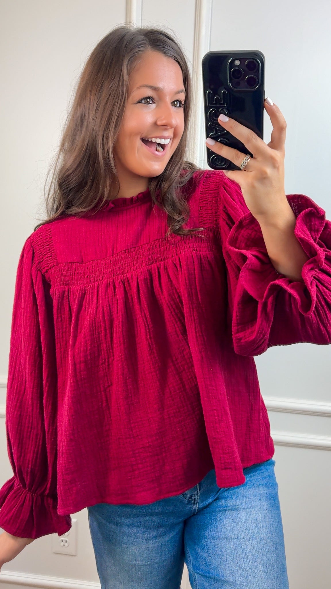 Sarah Top in Burgundy – Smocked Ruffle Top with Gauze Detailing