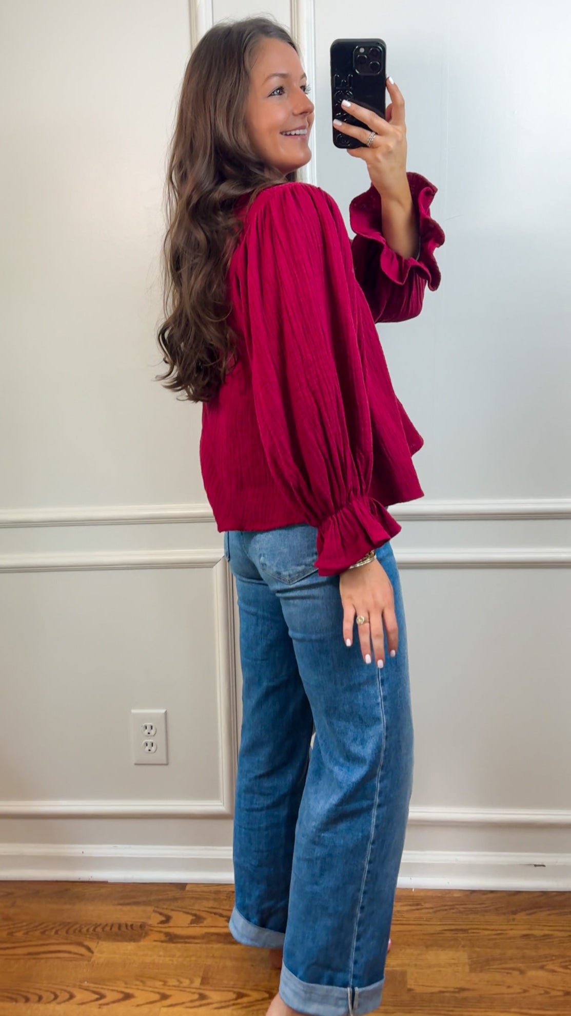The Sarah Top in Burgundy is the effortless fall blouse you’ll reach for again and again. With its soft smocked bodice, delicate ruffle accents, and airy gauze detailing, this top combines comfort with a feminine, seasonal edge.