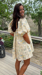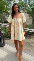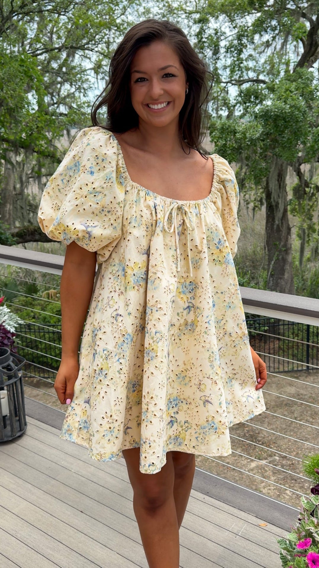 The Vivienne Dress is crafted in a cream-toned eyelet fabric scattered with soft blue floral prints, giving it a sweet, vintage-inspired charm. The babydoll silhouette feels easy and relaxed, while the stretch elastic neckline ensures a comfortable fit that can be worn on or off the shoulder. A bow at the front neckline adds just the right amount of femininity, making it a lovely choice for brunch, picnics, or slow mornings with coffee and sunshine. Fully lined for coverage and comfort, it’s one of those pieces that feels as good as it looks—effortless, romantic, and ready to go wherever the day takes you.